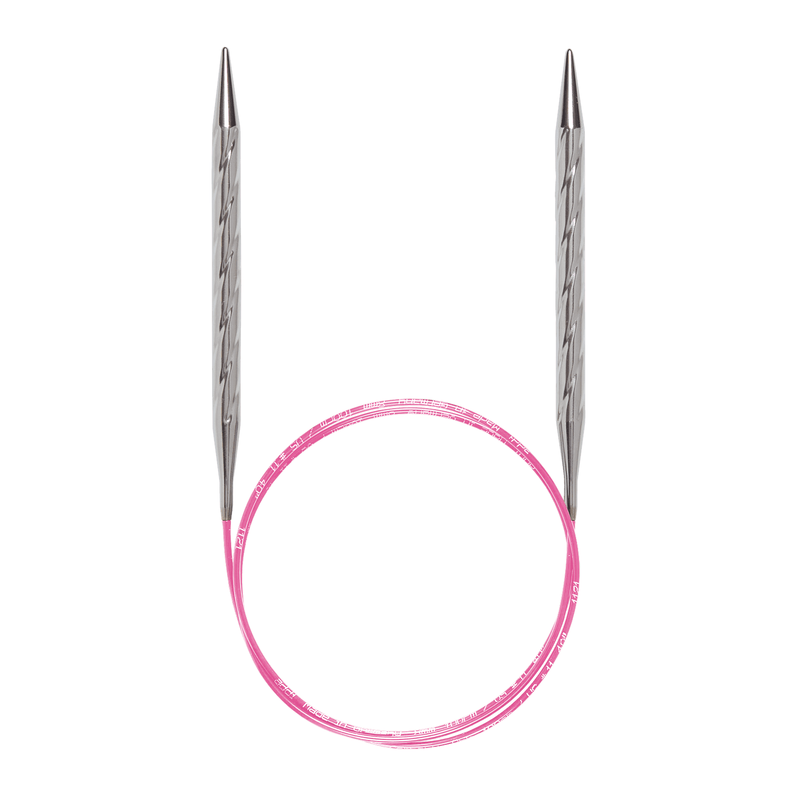 De to lette pinnene har en bølget struktur som masserer hendene mens du strikker, og garanterer komfort og timevis med strikkemoro. Den skinnende, glitrende overflaten på tuppene går sømløst over til en fleksibel rosa snor, som lar garnet ditt enkelt gli mens du jobber med prosjektet.