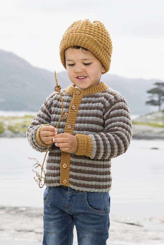 Viking Merino Superfine Olajakken og lue 1510-16 Størrelser 2 - 4 - 6 år Overvidde: 60 - 65 - 70 cm Hel lengde: 36 - 40 - 45 cm Ermelengde: 28 - 31 - 34 cm GARNALTERNATIV: Viking Merino Superfine ( 100% merinoull, superwash), Viking Sportsragg (60% ull, 20% nylon, 20% akryl), Viking Superwash (100% ull, superwash), Viking Sportsgarn (100% ull), nøster à 50g. JAKKE Lys grått nr 613: 3 - 3 - 4 nøster Brunt nr 608: 2 - 3 - 3 nøster Okergult nr 645: 2 - 2 - 2 nøster LUE Okergult nr 645: 2 - 2 - 2 nøster Veiledende pinner og tilbehør : Rundp og strømpep nr 3 og 3½. + 5-6-6 knapper. Strikkefasthet: 22 m glattstrikk i bredden på p nr 3 ½ måler ca 10 cm. Husk at strikkefastheten må holdes hvis resultat skal bli vellykket.