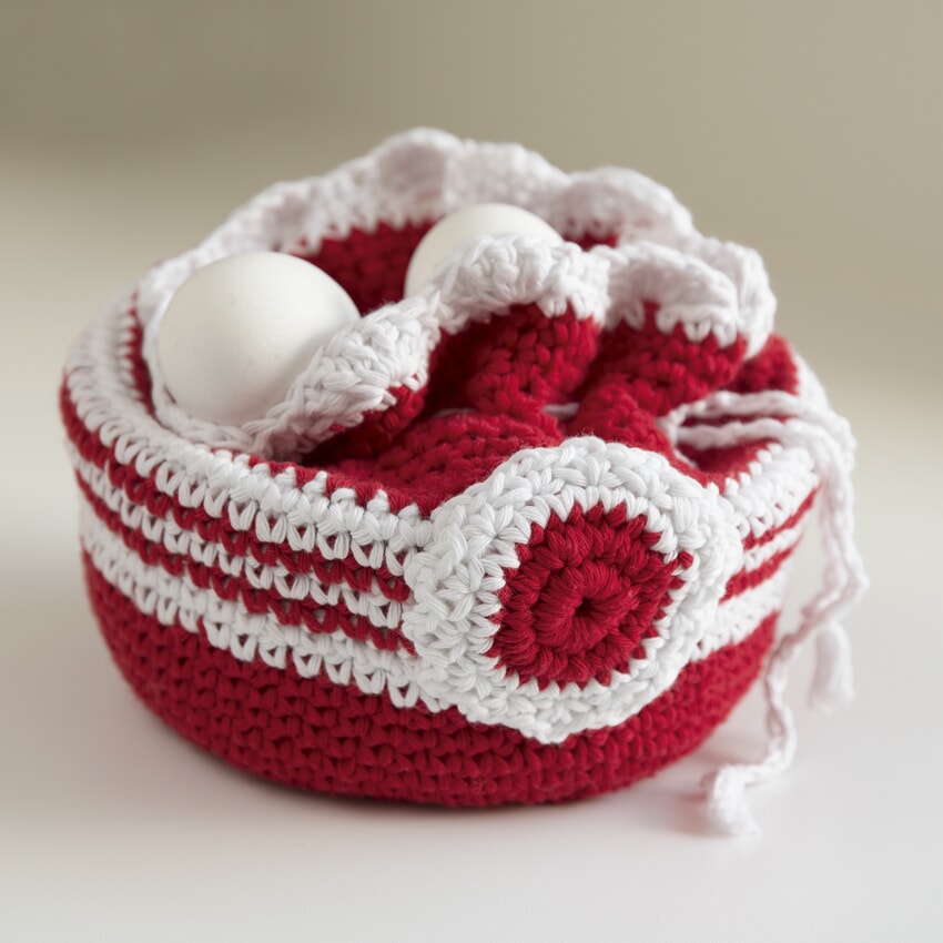 Viking Vår Eggeholder/pompadur 1513-3 Størrelse: Høyde ca: 25 cm Omkrets: ca: 45 cm GARNALTERNATIV: Viking Vår (100% bomull), nøster à 50 gr. Rødt nr. 450, ca. 2 nøster. Hvitt nr. 400, ca. 1 nøste. Veiledende pinner og tilbehør : Heklenål: 4½ mm.