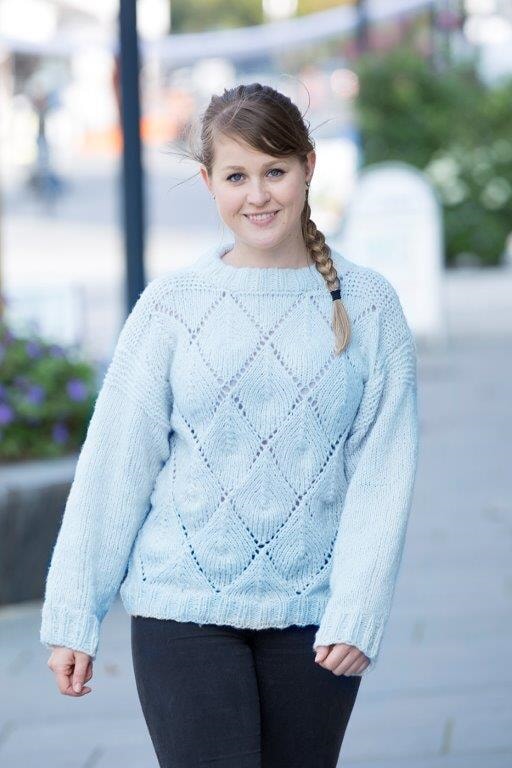 Strikkefasthet: 14 masker glattstrikk på pinne nr 7 måler ca 10 cm.