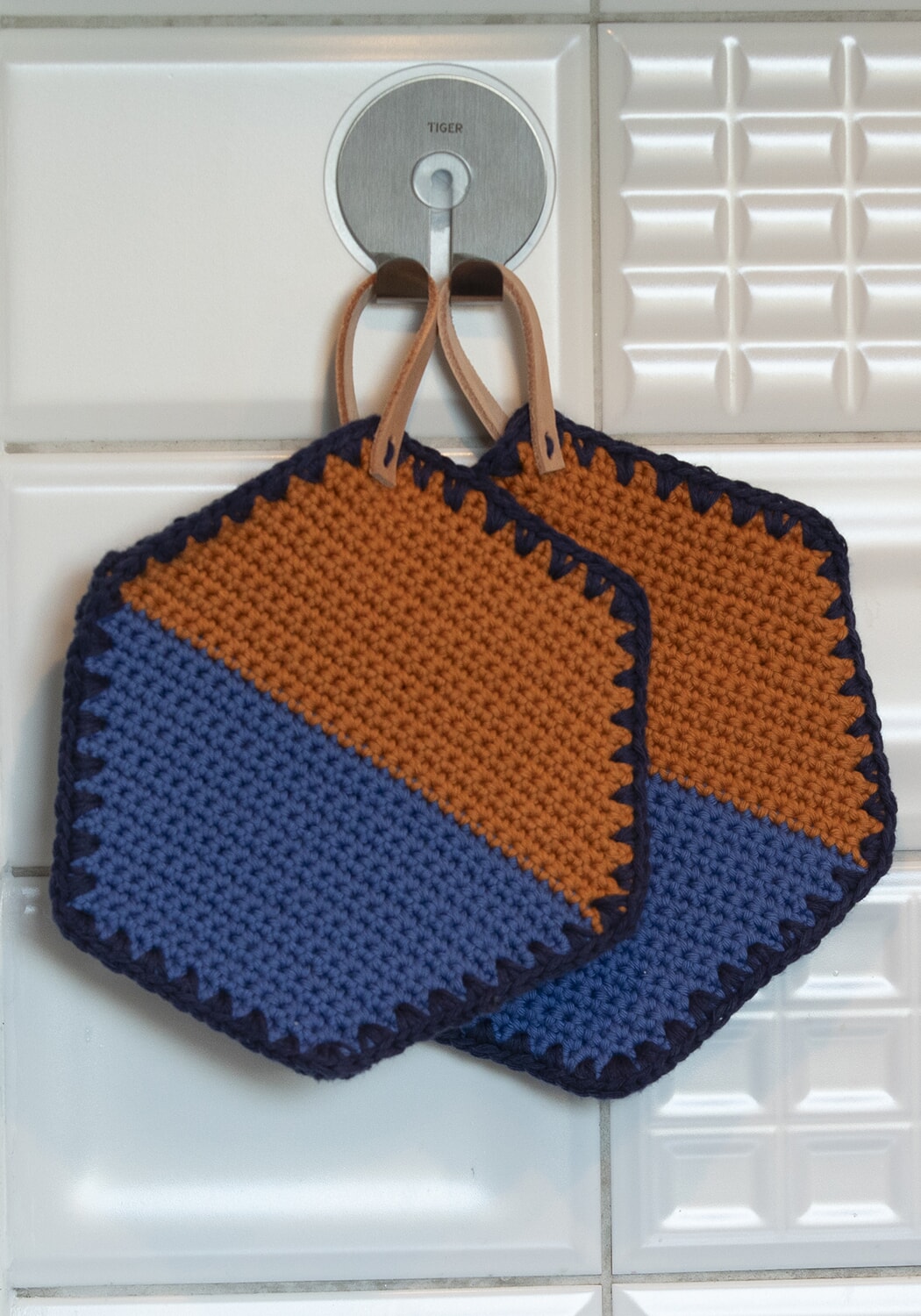 Veiledende pinner: Heklenål 4 mm + lærreimer.