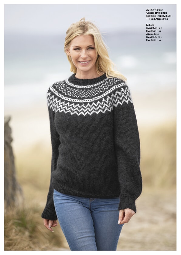 Størrelse: xx/liten-x/liten-liten-middels-stor-x/stor-xx/stor-xxx/stor Overvidde: 80 - 88 - 95 - 103 - 110 - 118 - 125 - 133 cm Hel lengde: 60 - 62 - 64 - 66 - 67 - 68 - 69 - 70 cm Ermelengde: 45 - 46 - 47 - 48 - 49 - 49 - 50 - 50 cm GARNALTERNATIV: Kid Silk (77% Kid Mohair, 23 % silke), nøster à 25 g og Alpaca Fine (85% Superfine Alpaca, 15% Highland ull), nøster à 50g Veiledende pinner og tilbehør: Pinner nr 4 ½ og 5 Strikkefasthet: 16 m glattstrikk i bredden med 1 tråd Kid Silk og 1 tråd Alpaca Fine på pinne nr 5 måler ca 10 cm. Husk at strikkefastheten må holdes hvis resultatet skal bli vellykket. Hele plagget strikkes med 2 tråder samtidig, 1 tråd alpaca Fine og 1 tråd Kid Silk