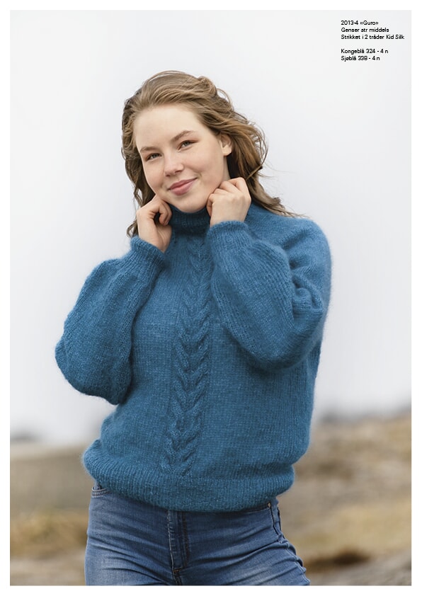Størrelser:xx/liten-x/liten-liten-middels-stor-x/stor-xx/stor Overvidde: 80 - 88 - 95 - 102 - 112 - 123 - 133 cm Hel lengde: ca 56 - 58 - 60 - 61 - 62 - 63 - 64 cm Ermelengde: 45 - 46 - 48 - 49 - 49 - 50 - 50 cm GARNALTERNATIV: Kid Silk (77% Kid Mohair, 23 % silke), nøster à 25 g Veiledende pinner og tilbehør: Pinner nr 4 og 5 Strikkefasthet: 16 m glattstrikk i bredden med 2 tråder Kid Silk på pinne nr 5 måler ca 10 cm. Husk at strikkefastheten må holdes hvis resultatet skal bli vellykket. Hele plagget strikkes med 2 tråder samtidig, 1 tråd i hver farge