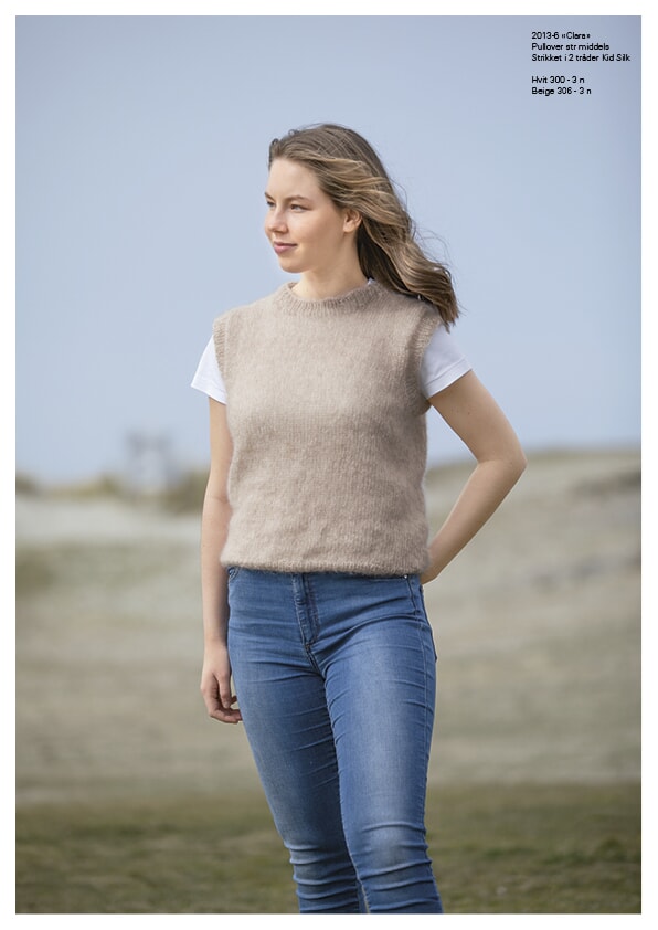 Størrelser: x/liten-liten-middels-stor-x/stor-xx/stor Overvidde: 88 - 93 - 98 - 105 - 115 - 125 cm Hel lengde: ca 51 - 53 - 55 - 56 - 57 - 59 cm GARNALTERNATIV: Kid Silk (77% Kid Mohair, 23 % silke), nøster à 25 g. Strikkefasthet: 16 m glattstrikk i bredden med 2 tråder Kid Silk på pinne nr 5 måler ca 10 cm. Husk at strikkefastheten må holdes hvis resultatet skal bli vellykket. Hele plagget strikkes med 2 tråder samtidig, 1 tråd i hver farge