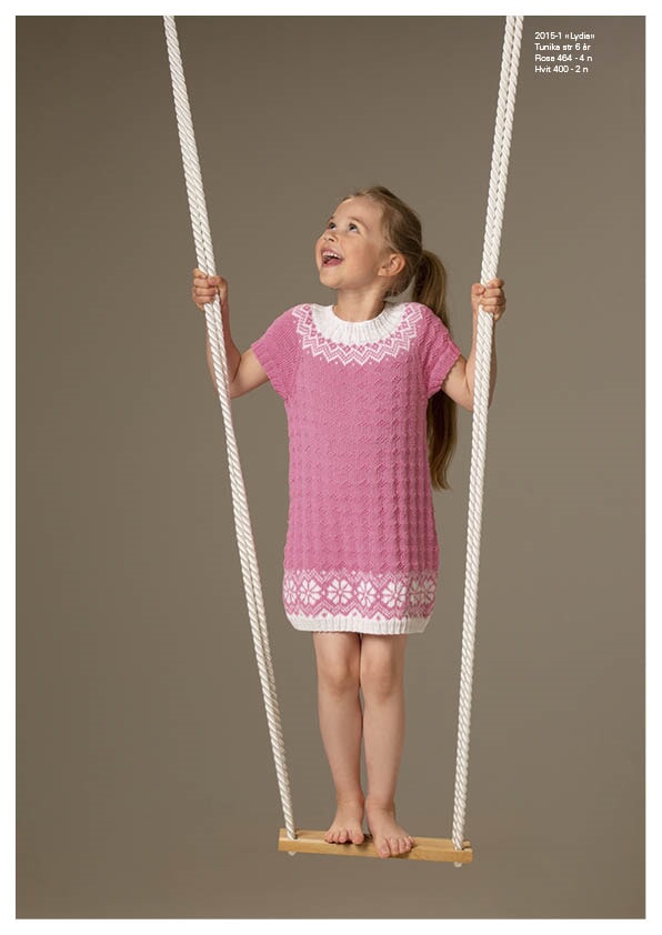 Bambino «Lydia»-tunika 2015-1 Størrelser: 2 - 4 - 6 - 8 - 10 - 12 år Overvidde: 57 - 63 - 69 - 74 - 80 - 86 cm Hel lengde: 40 - 45 - 50 - 55 - 60 - 65 cm GARNALTERNATIV: Bambino (50% bomull, 50% ekte bambus), Baby ull (100% merinoull, superwash), Alpaca Fine (85% Superfine Alpaca, 15% Highland wool), nøster à 50 gram.