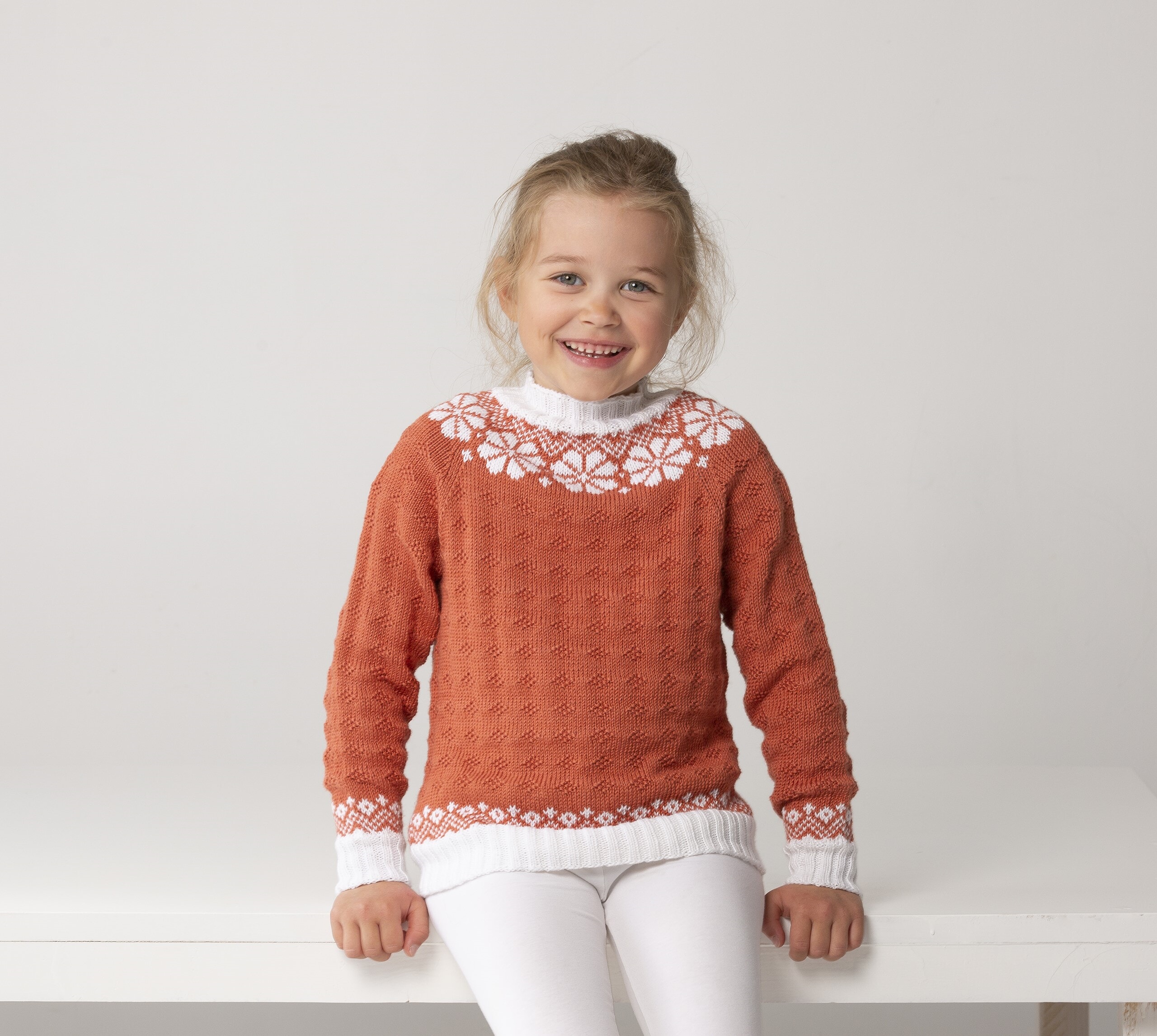 Bambino «Lydia»-genser 2015-4 Størrelser: 2 - 4 - 6 - 8 - 10 - 12 år Overvidde: 57 - 63 - 69 - 74 - 80 - 86 cm Hel lengde: 30 - 35 - 40 - 45 - 50 - 55 cm Ermelengde: 24 - 28 - 32 - 36 - 40 - 44 cm GARNALTERNATIV: Bambino (50% bomull, 50% ekte bambus), Baby ull (100% merinoull, superwash), Alpaca Fine (85% Superfine Alpaca, 15% Highland wool), nøster à 50 gram. Oransje nr 453: 3 - 3 - 4 - 4 - 5 - 5 nøster Hvit nr 400: 1 - 1 - 2 - 2 - 2 - 2 nøster Veiledende pinner og tilbehør: Pinner nr 2 ½ og 3. Strikkefasthet: 28 m glattstrikk i bredden på pinne nr 3 måler ca 10 cm. Husk at strikkefastheten må holdes hvis resultatet skal bli vellykket.