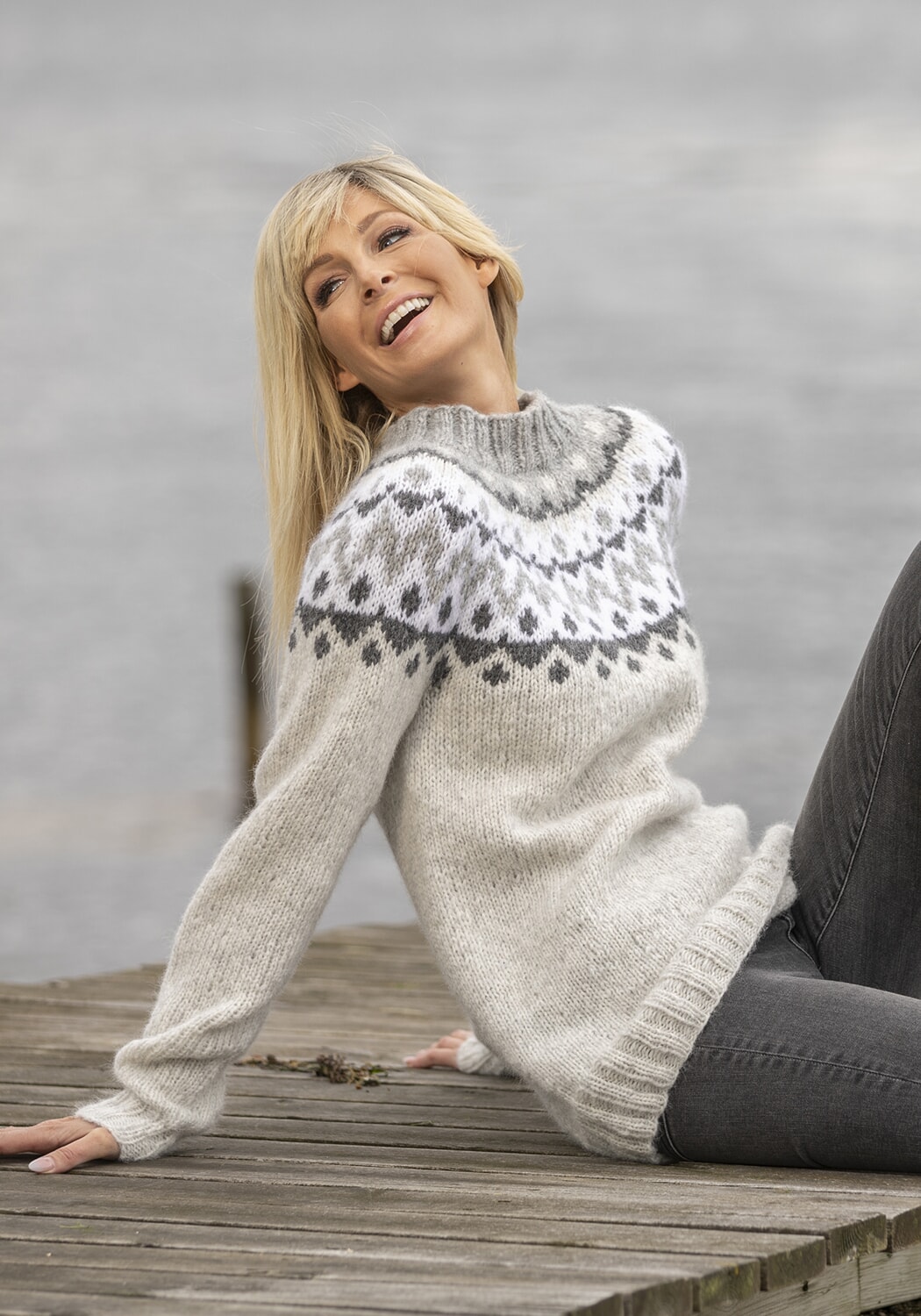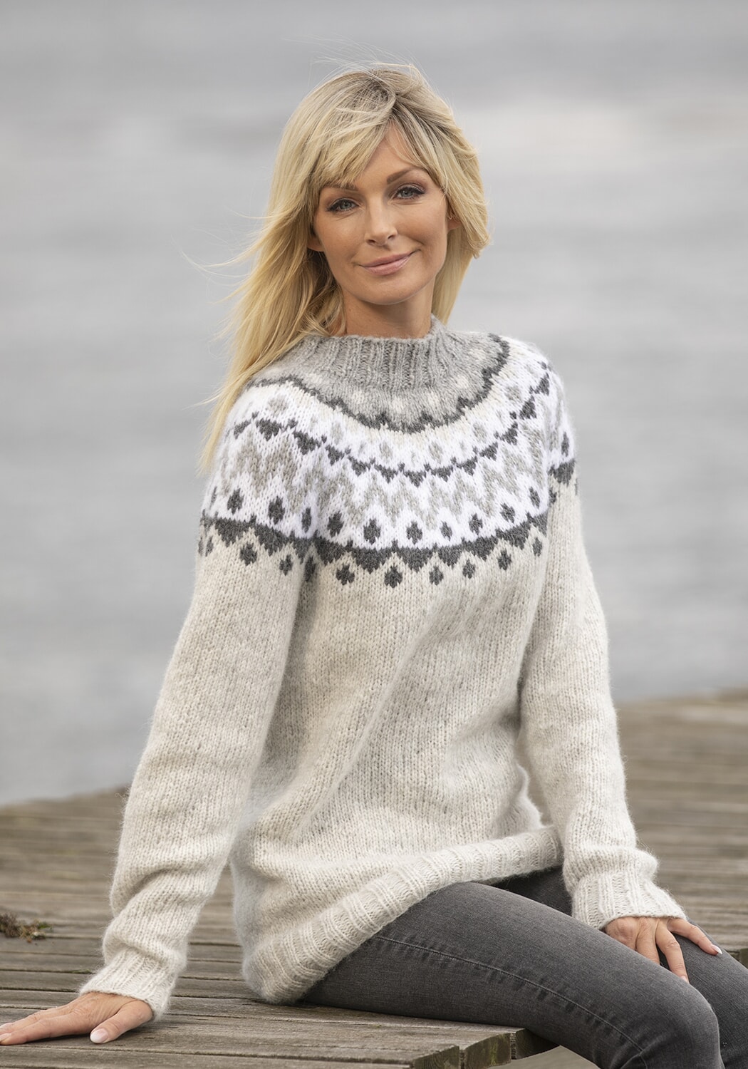 Alpaca Bris «Suna»-genser 2022-1 Størrelse x/liten - liten - middels - stor - x/stor - xx/stor Overvidde: 88 - 96 - 104 - 112 - 120 - 128 cm Hel lengde: 64 - 65 - 66 - 67 - 69 - 70 cm Ermelengde: 44 - 45 - 46 - 47 - 48 - 49 cm GARNALTERNATIV: Alpaca Bris (60% baby alpaca, 11% merino ull, 29% nylon), nøster à 50g. Perlegrå nr 312: 4 - 5 - 5 - 6 - 6 - 7 nøster Lys grå nr 313: 1 - 1 - 1 - 1 - 1 - 2 nøster Hvit nr 300: 1 - 1 - 1 - 1 - 1 - 2 nøster Grå nr 315: 1 - 1 - 1 - 1 - 1 - 1 nøste Veiledende pinner: Pinner nr 5 og 6. Strikkefasthet: 15 m glattstrikk i bredden på pinne nr 6 eller 7 måler ca 10 cm. Husk at strikkefastheten må holdes hvis resultat skal bli vellykket.
