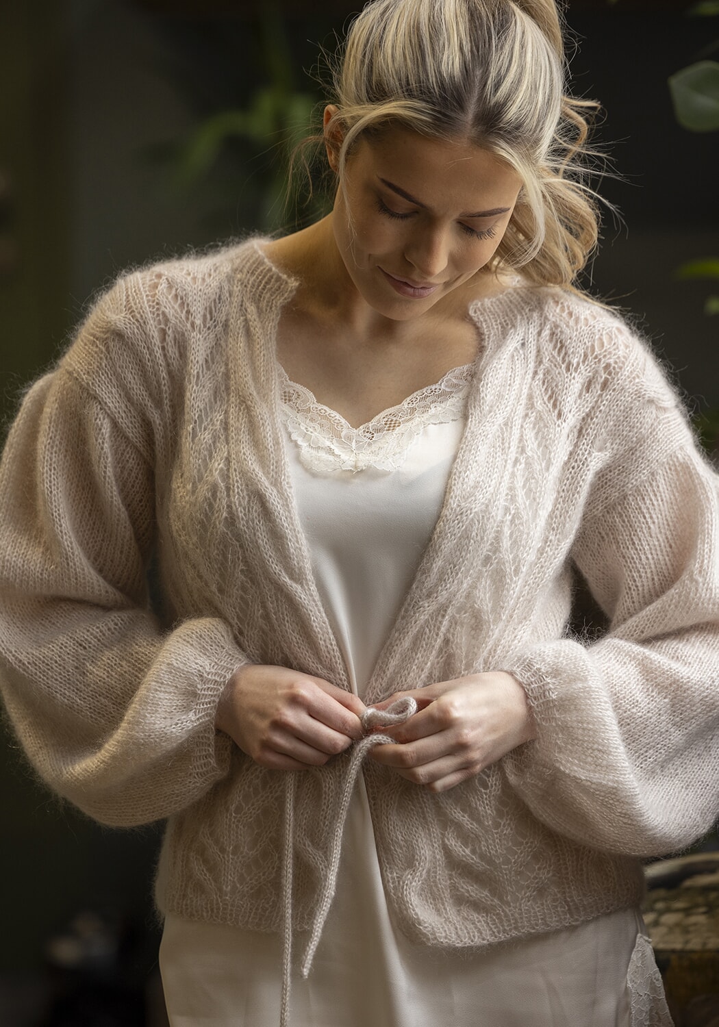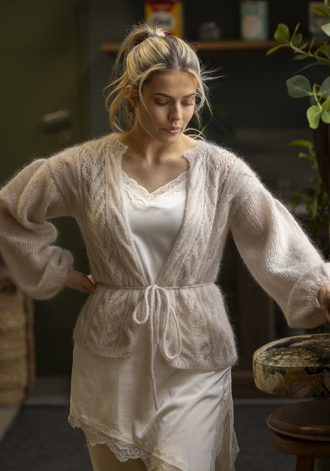 Hele plagget strikkes med 2 tråder Kid Cotton.