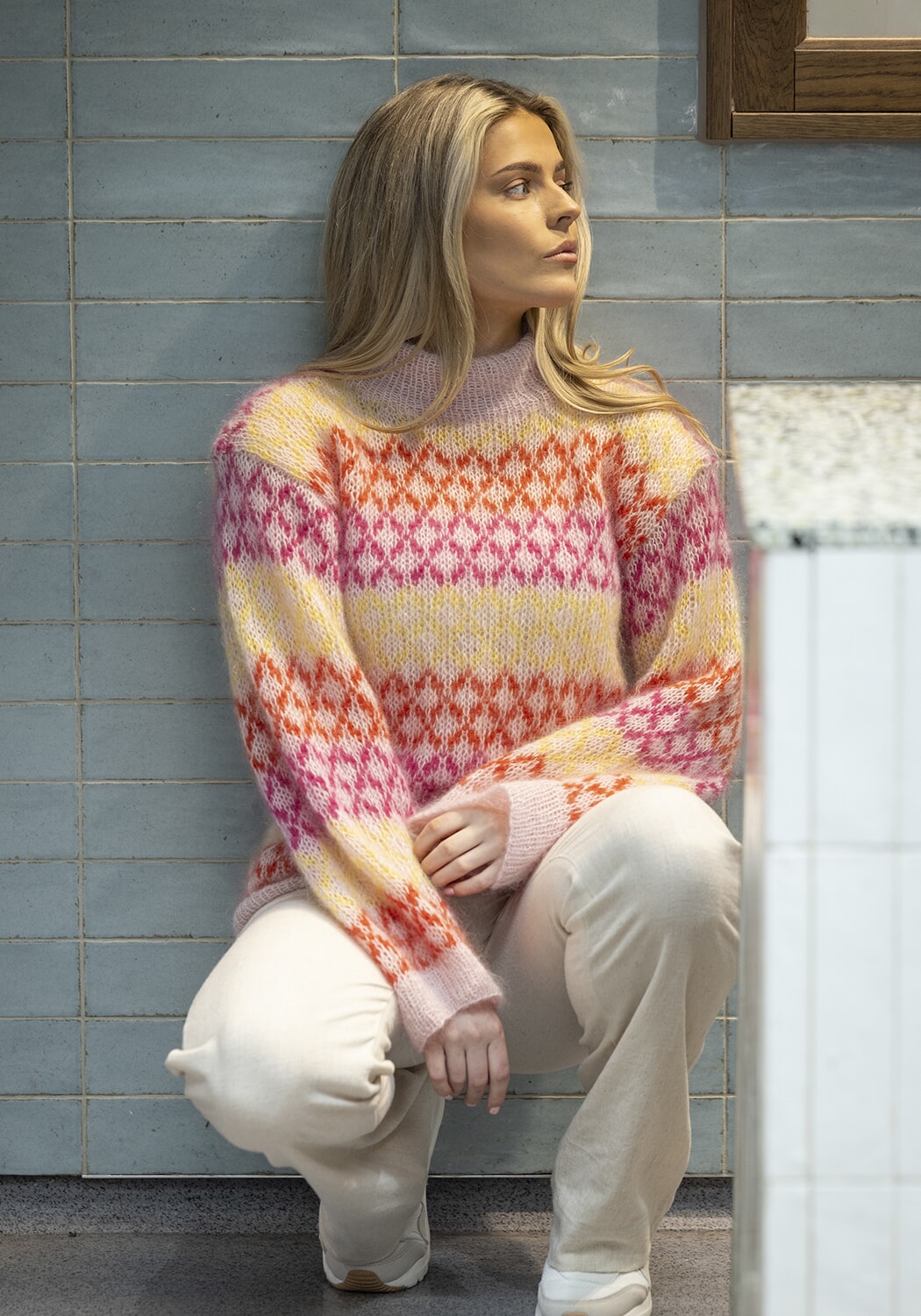Strikkefasthet: 16 m glattstrikk i bredden med 2 tråder Kid Cotton på pinne nr 5 eller 6 måler ca 10 cm. Husk at strikkefastheten må holdes hvis resultatet skal bli vellykket.
