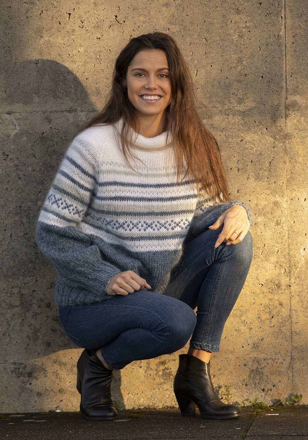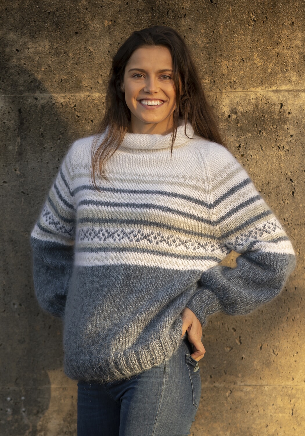 Strikkefasthet: 14 m glattstrikk i bredden med 2 tråder Kid Silk og 1 tråd Alpaca Liten Storm på pinne nr 7 måler ca 10 cm. Husk at strikkefastheten må holdes hvis resultatet skal bli vellykket.