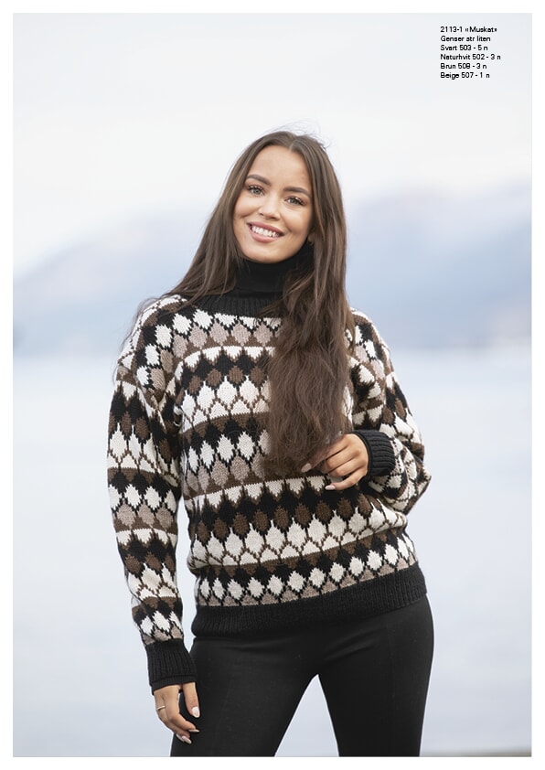 Alpaca Storm «Muskat»-genser 2113-1 Størrelser: x/liten - liten - middels - stor - x/stor - xx/stor Overvidde: 87 - 95 - 102 - 109 - 120 - 127 cm Hel lengde: 62 - 63 - 64 - 65 - 66 - 67 cm Ermelengde: 48 - 49 - 50 - 51 - 52 - 53 cm GARNALTERNATIV: Alpaca Storm (40% Superfine Alpaca, 40% Merino Ull, 20% Nylon), Merino (100% Supersoft Merino Ull, superwash), Sportsragg (60% Ull, 20% Akryl, 20% Nylon), Superwash (100% Superwash Ull), Bamboo (50% Bomull, 50% ekte Bambus), nøster à 50 gr. Veiledende pinner: Pinner nr 3 og 4.