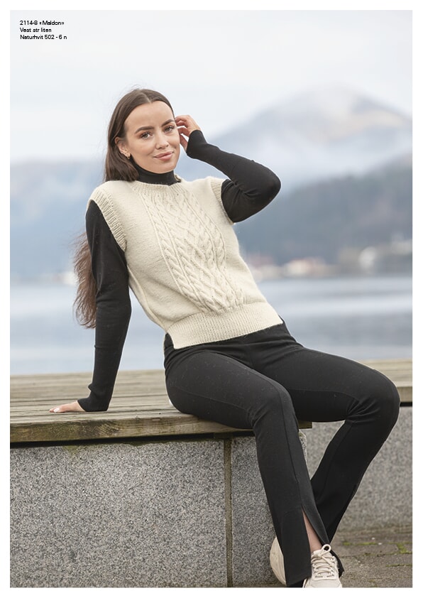 Alpaca Storm «Maldon»-vest 2114-8 Størrelser: x/liten - liten - middels - stor - x/stor - xx/stor Overvidde: 87 - 96 - 104 - 113 - 120 - 129 cm Hel lengde: 57 - 59 - 60 - 61 - 62 - 63 cm GARNALTERNATIV: Alpaca Storm (40% Superfine Alpaca, 40% merino ull, 20% nylon), Merino (100% Supersoft Merino ull, superwash), Sportsragg (60% ull, 20% akryl, 20% nylon), Superwash (100% superwash ull), Bamboo (50% bomull, 50% ekte bambus), nøster à 50 gr. Veiledende pinner: Pinner nr 3 og 4.