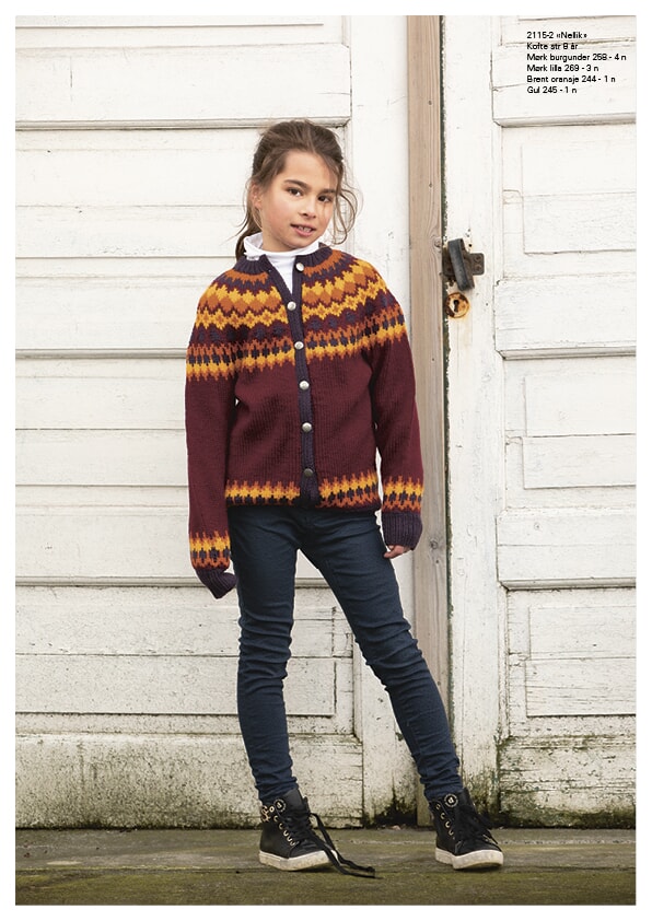 Eco Highland Wool «Nellik»-kofte 2115-2 Størrelser: 2 - 4 - 6 - 8 - 10 - 12 år Overvidde: 61 - 65 - 71 - 75 - 81 - 85 cm Hel lengde: 36 - 40 - 45 - 50 - 54 - 58 cm Ermelengde: 23 - 28 - 31 - 36 - 40 - 43 cm GARNALTERNATIV: Eco Highland Wool (100% Highland Wool), Vår (100 % bomull), nøster à 50 gr. Mørk burgunder nr 258: 3 - 3 - 4 - 4 - 5 - 6 n Mørk lilla nr 269: 2 - 2 - 2 - 3 - 3 - 3 n Brent oransje nr 244: 1 - 1 - 1 - 1 - 2 - 2 n Gul nr 245: 1 - 1 - 1 - 1 - 1 - 1 n Veiledende pinner og tilbehør: Pinner nr 3 og 4 ½ + 6 – 6 – 7 – 7 – 7 – 8 knapper