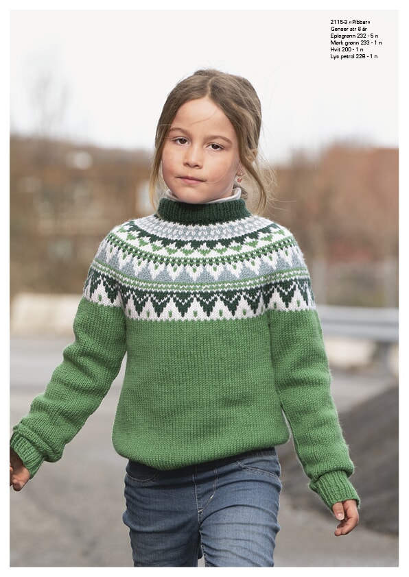 Eco Highland Wool «Pibbar»-genser 2115-3 Størrelser: 2 - 4 - 6 - 8 - 10 - 12 år Overvidde: 60 - 66 - 70 - 76 - 80 - 86 cm Hel lengde: 36 - 40 - 45 - 50 - 54 - 58 cm Ermelengde: 23 - 28 - 31 - 36 - 40 - 43 cm GARNALTERNATIV: Eco Highland Wool (100% Highland Wool), Vår (100 % bomull), nøster à 50 gr. Eplegrønn nr 232: 3 - 4 - 4 - 5 - 5 - 6 nøster Mørk grønn nr 233: 1 - 1 - 1 - 1 - 3 - 3 nøster Hvit nr 200: 1 - 1 - 1 - 1 - 1 - 2 nøster Lys petrol nr 228: 1 - 1 - 1 - 1 - 1 - 1 nøste Veiledende pinner: Pinner nr 3 og 4 ½.