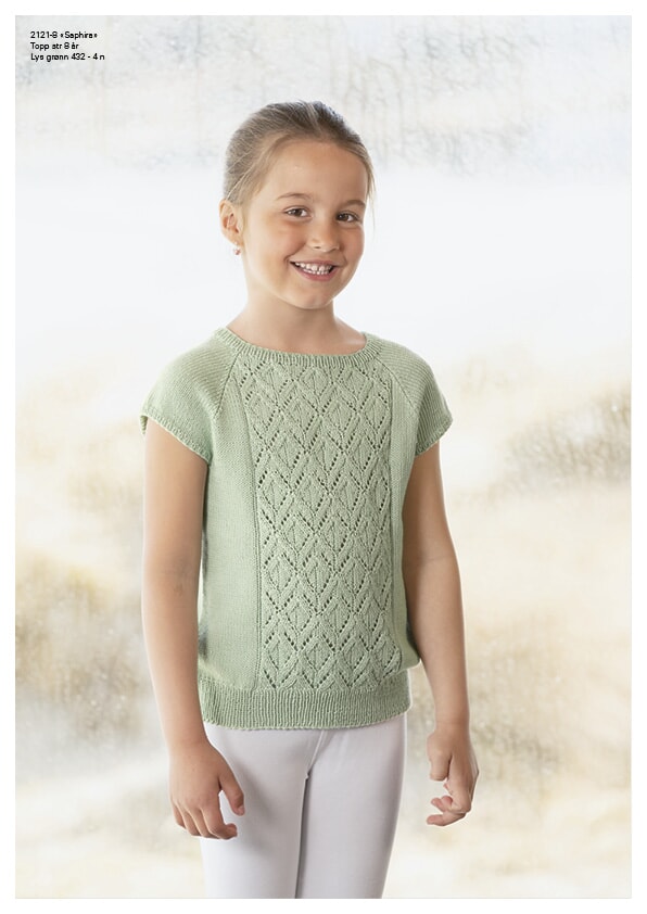 Bambino «Saphira»-topp 2121-8 Størrelser: 2 - 4 - 6 - 8 - 10 - 12 år Overvidde: 57 - 61 - 66 - 70 - 74 - 80 cm Hel lengde: 30 - 34 - 38 - 42 - 46 - 50 cm GARNALTERNATIV: Bambino (50 % Bomull, 50 % Ekte Bambus), Baby Ull (100 % Merino Superwashull), Alpaca Fine (85 % Superfin Alpakka, 15 % Highland Ull), nøster a 50 gr Veiledende pinner: Pinner nr 2 ½ og 3.