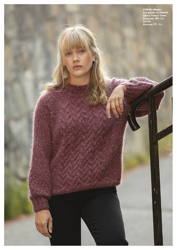 GARNALTERNATIV: Alpaca Picasso Tweed (30% Superfine Alpaca, 30% merino, 20% Donegal Tweed, 20% Nylon), nøster à 50 gr og Kid Silk (77% Kid Mohair, 23% silke), nøster à 25 gr.