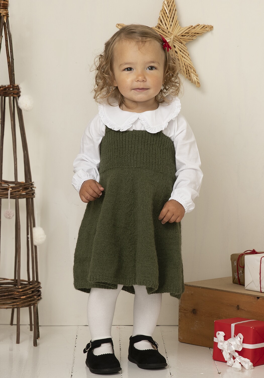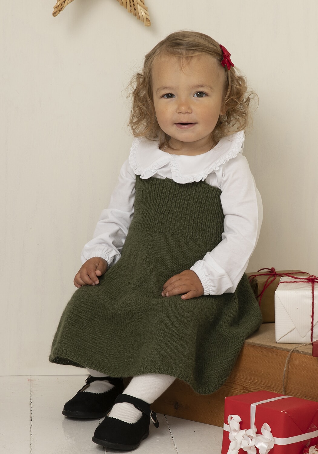 Størrelse: 2 - 4 - 6 - 8 - 10 - 12 år Overvidde: 51 - 54 - 60 - 64 - 71 - 75 cm Hel lengde: 48 - 54 - 61 - 68 - 76 - 84 cm GARNALTERNATIV: Alpaca Fine (85% Superfin Alpakka, 15% Highland Ull), Baby Ull (100 % Merino, Superwashull), Bambino (50% Bomull, 50% Ekte Bambus), nøster à 50 g. Veiledende pinner: Pinner nr 2 ½ og 3. Strikkefashet: 28 m glattstrikk i bredden på pinne nr 3 måler ca 10cm. Husk at strikkefastheten må holdes hvis resultatet skal bli vellykket.