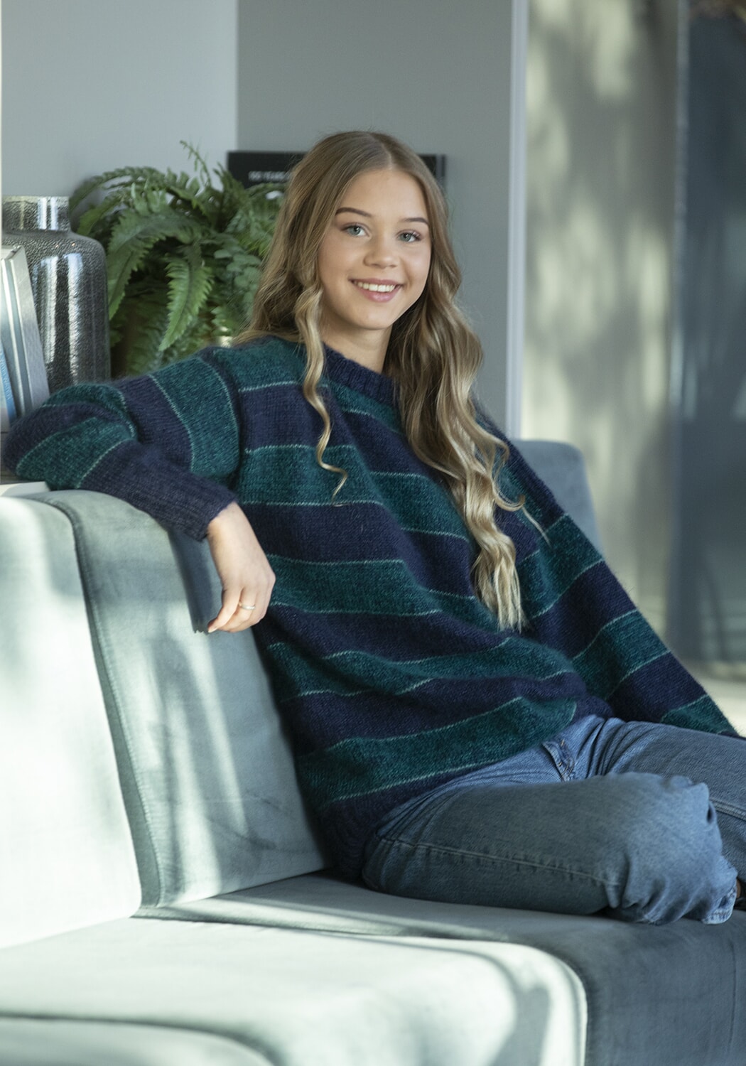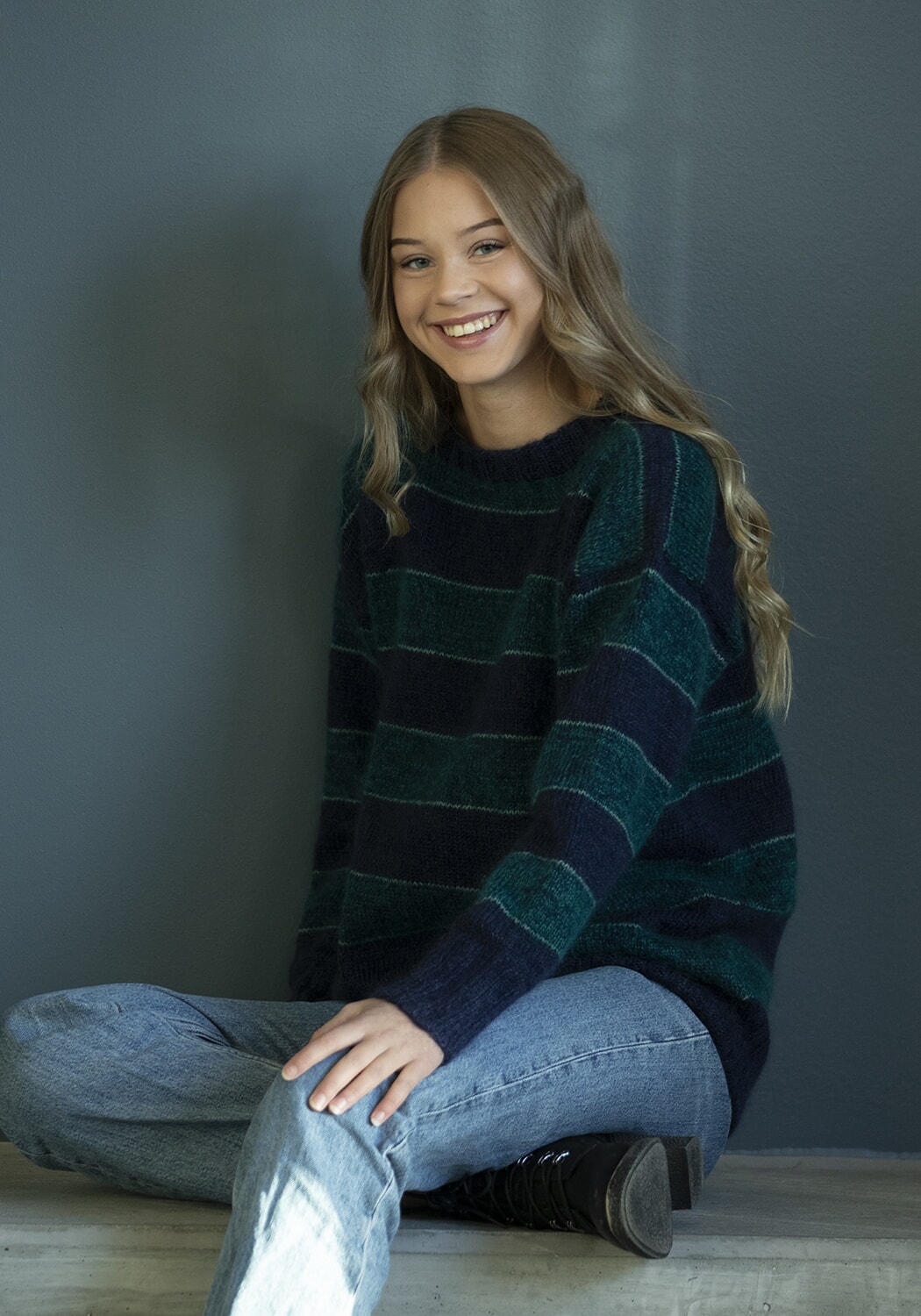 Hele plagget strikkes ovenfra og ned med 2 tråder samtidig, 1 tråd Baby Ull og 1 tråd Kid Silk