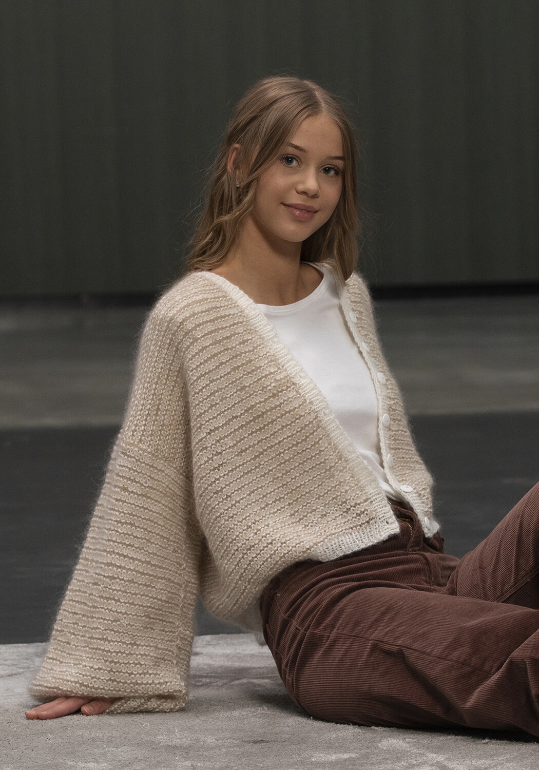 Hele plagget strikkes ovenfra og ned i rillestrikk med 2 tråder samtidig, 1 tråd Baby Ull og en tråd Kid Silk i hvitt eller 2 tråder Kid Silk i beige