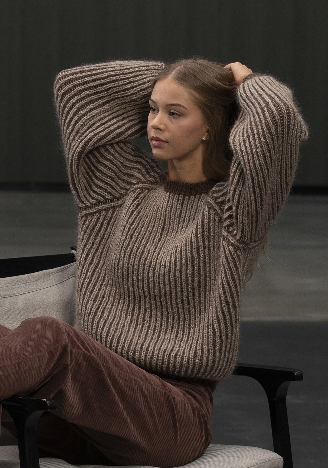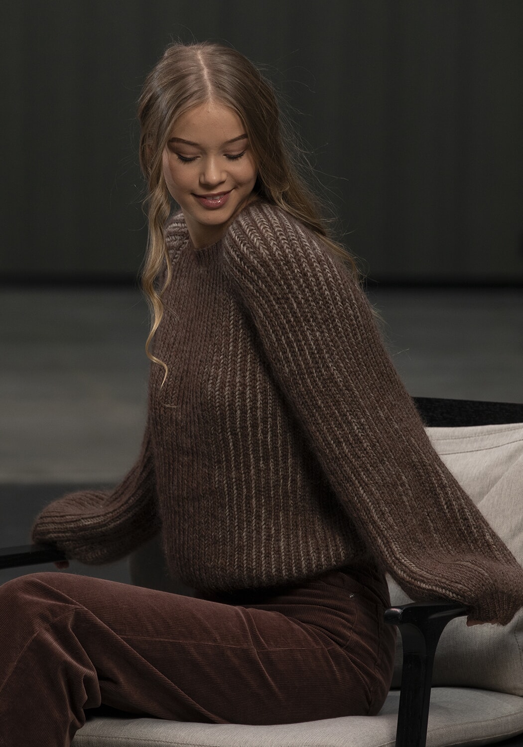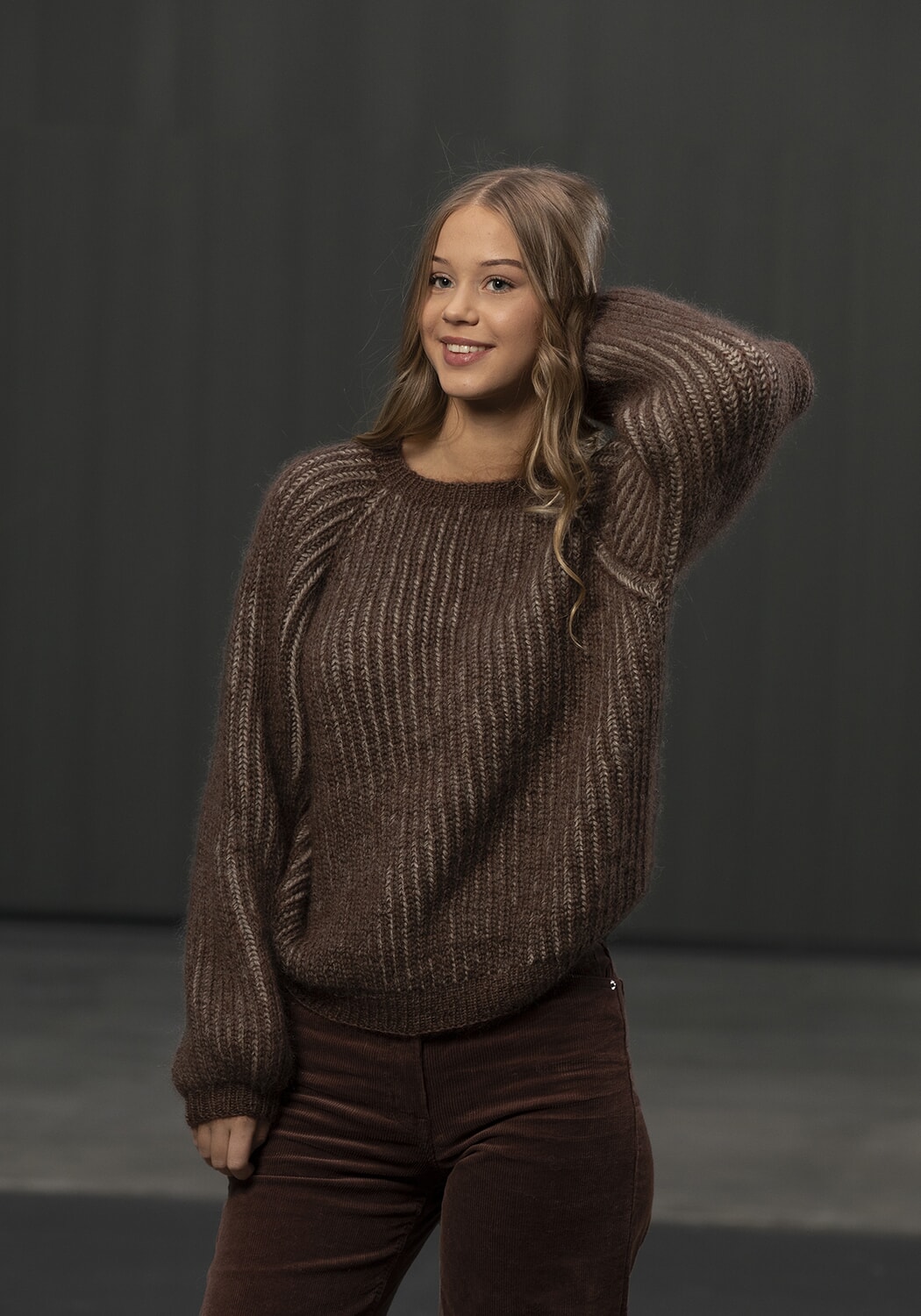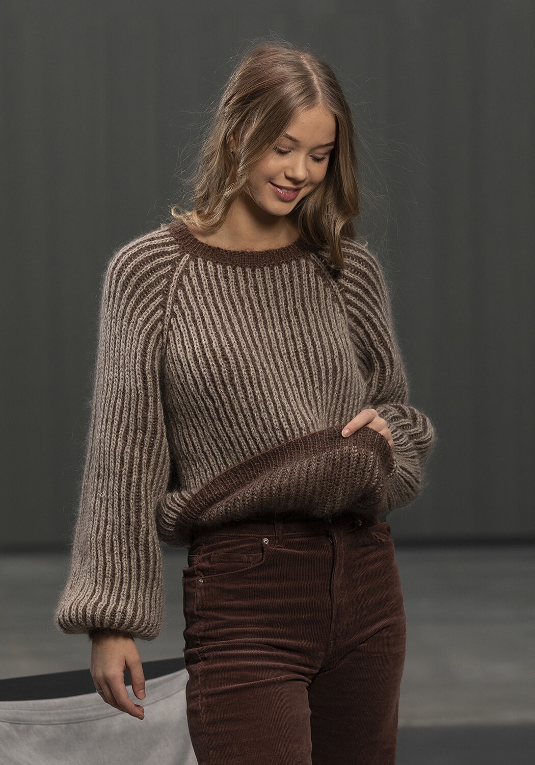 Hele plagget strikkes ovenfra og ned med 2 tråder samtidig, 1 tråd Baby Ull og 1 tråd Kid Silk