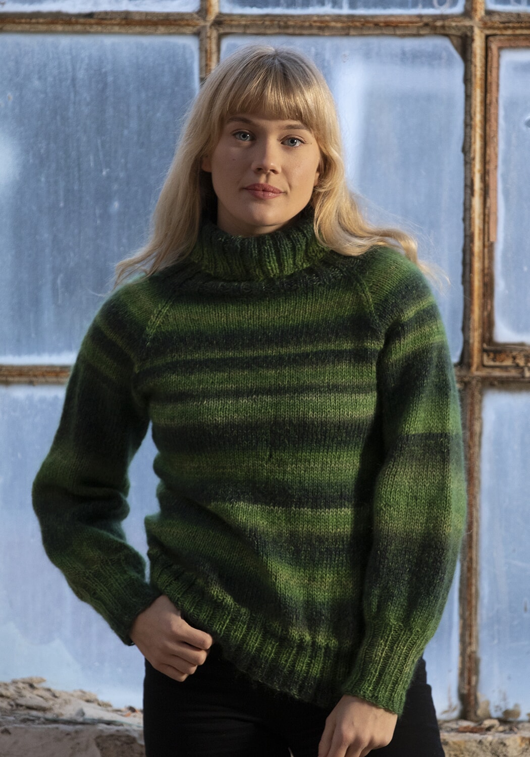 Hele plagget strikkes med 2 tråder samtidig, 1 tråd Nordlys og 1 tråd Kid Silk.
