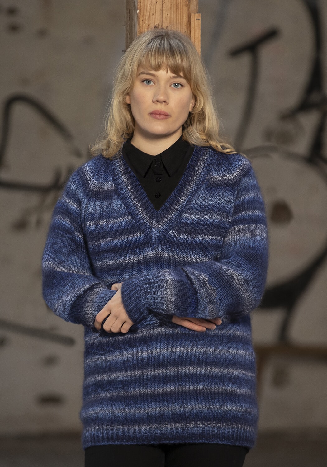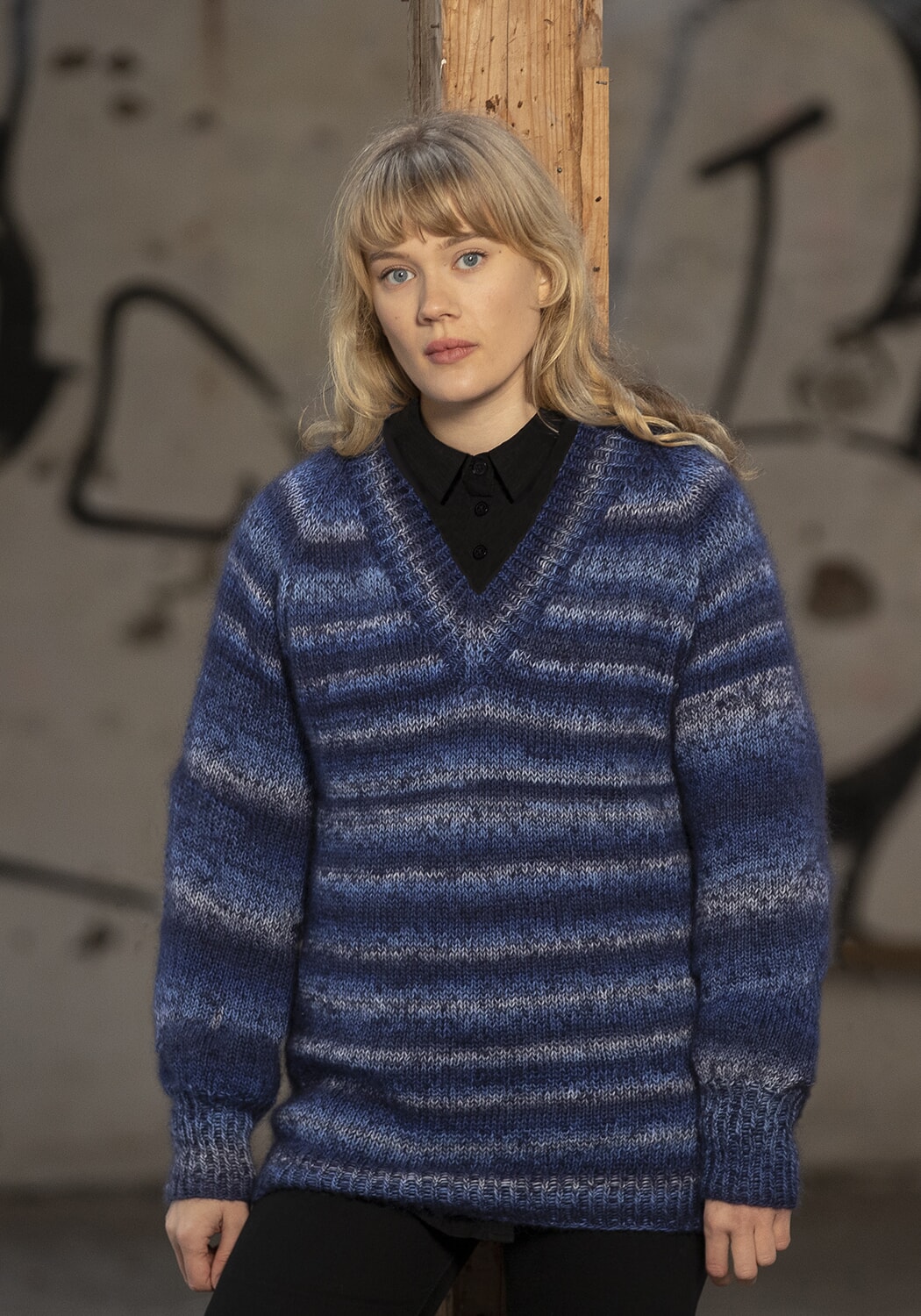 Hele plagget strikkes med 2 tråder samtidig, 1 tråd Nordlys og 1 tråd Kid Silk.