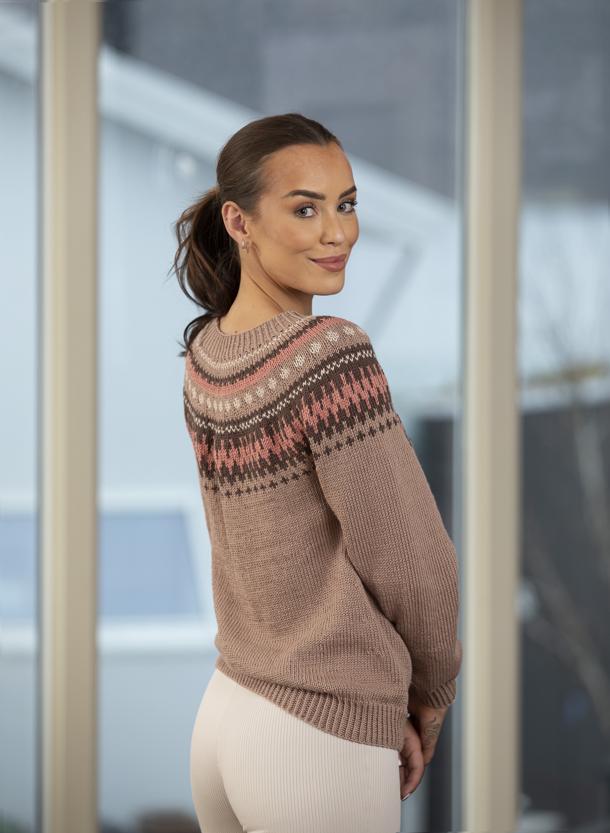 Størrelser: x/liten- liten- middels- stor - x/stor - xx/stor Overvidde: 85 - 93 - 100 - 107 - 115 - 124 Hel lengde: 60 - 61 - 63 - 64 - 65 - 66 Ermelengde: 44 - 45 - 46 - 47 - 48 - 49 GARNALTERNATIV: Bamboo (50 % Bambus, 50 % Bomull), nøster à 50g, Alpaca Storm (40% Alpakka Superfine, 40% Merino Ull, 20% Nylon), Merino (100 % Merino Ull, Superwash), Sportsragg (60% Ull, 20% Akryl, 20% Nylon), Superwash (100% Ull, superwash), nøster à 50g Valnøtt nr 610: 8 - 9 - 9 - 10 - 10 - 11 nøster Brun nr 608: 2 - 2 - 2 - 2 - 3 - 3 nøster Aprikos nr 609: 1 - 1 - 1 - 2 - 2 - 2 nøster Beige nr 607: 1 - 1 - 1 - 1 - 1 - 2 nøster Veiledende pinner: Pinner nr 3 og 3 ½. Strikkefasthet: 22 m glattstrikk i bredden på pinne nr 4 måler ca 10 cm. Husk at strikkefastheten må holdes hvis resultatet skal bli vellykket.