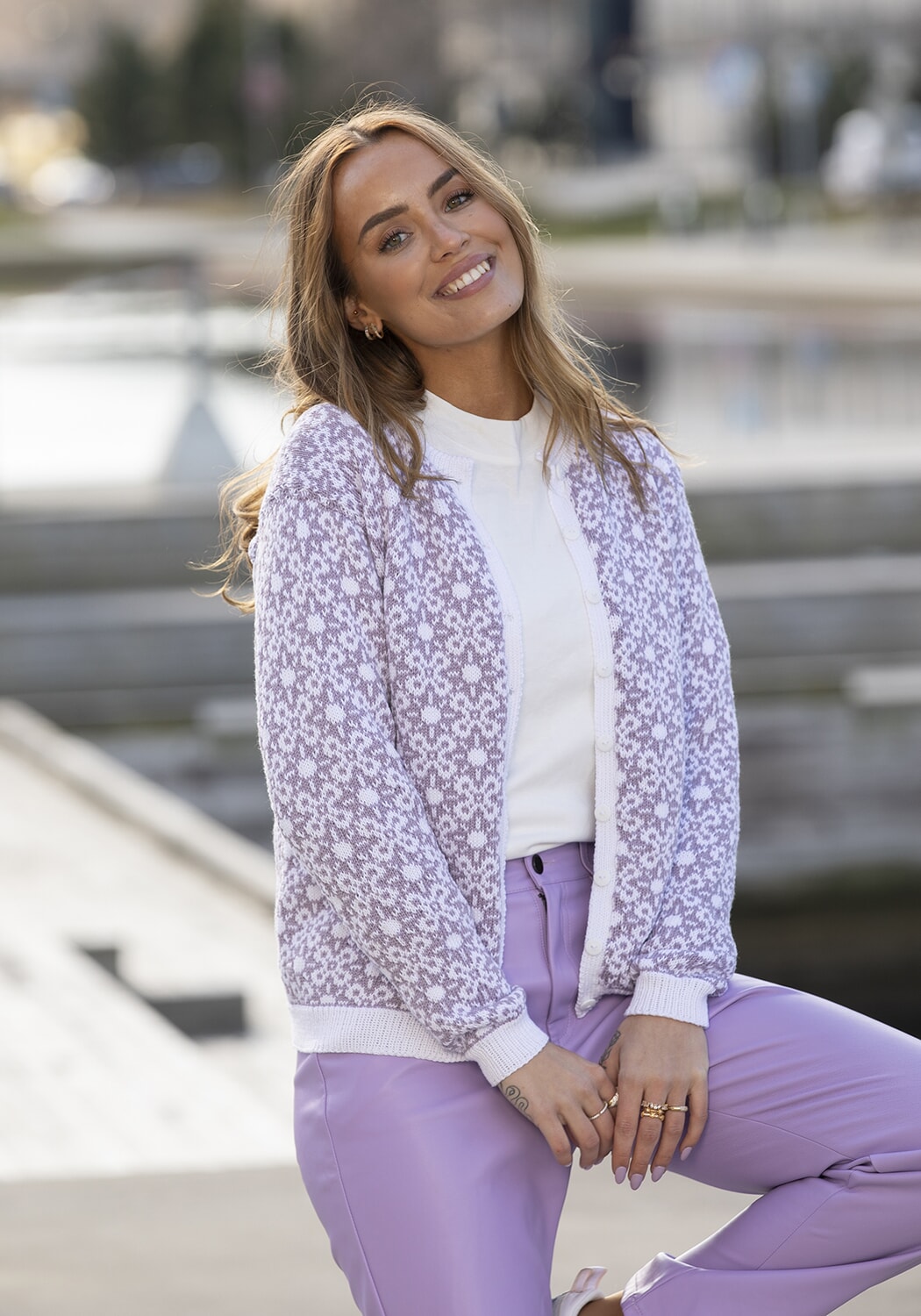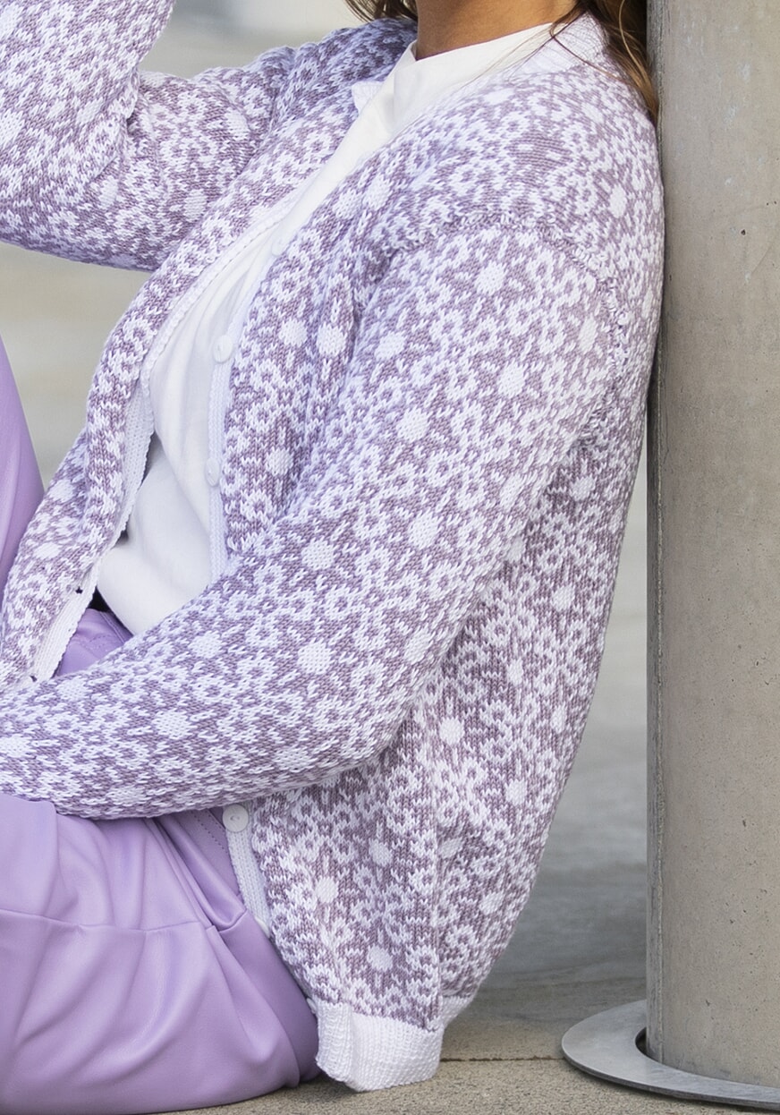 Størrelser: x/liten - liten - middels - stor - x/stor - xx/stor Overvidde: 89 - 98 - 106 - 115 - 123 - 132 cm Hel lengde: 59 - 60 - 60 - 61 - 62 - 64 cm Ermelengde: 47 - 48 - 49 - 50 - 51 - 52 cm GARNALTERNATIV: Bambino (50% Bomull, 50% Ekte Bambus), Trend Merino Petite (100% Ekstra fin Merino ull), Trend Baby Merino (100% Ekstra Fin Merino ull, superwash), Alpaca Fine (85% Superfine Alpaca, 15% Highland Wool), Baby Ull (100 % Merino Ull, superwash), nøster à 50 g. Lys lilla nr 467: 5 - 5 - 6 - 6 - 7 - 7 nøster Hvit nr 400: 4 - 5 - 5 - 6 - 6 - 7 nøster Veiledende pinner og tilbehør: Pinner nr 2 ½ og 3. 9 knapper. Strikkefasthet: 28 m glattstrikk i bredden på pinne nr 3 måler ca 10 cm. Husk at strikkefastheten må holdes hvis resultatet skal bli vellykket.
