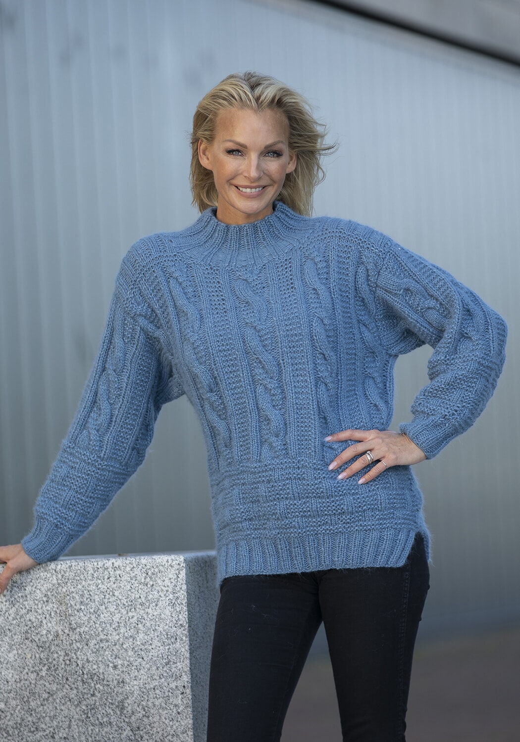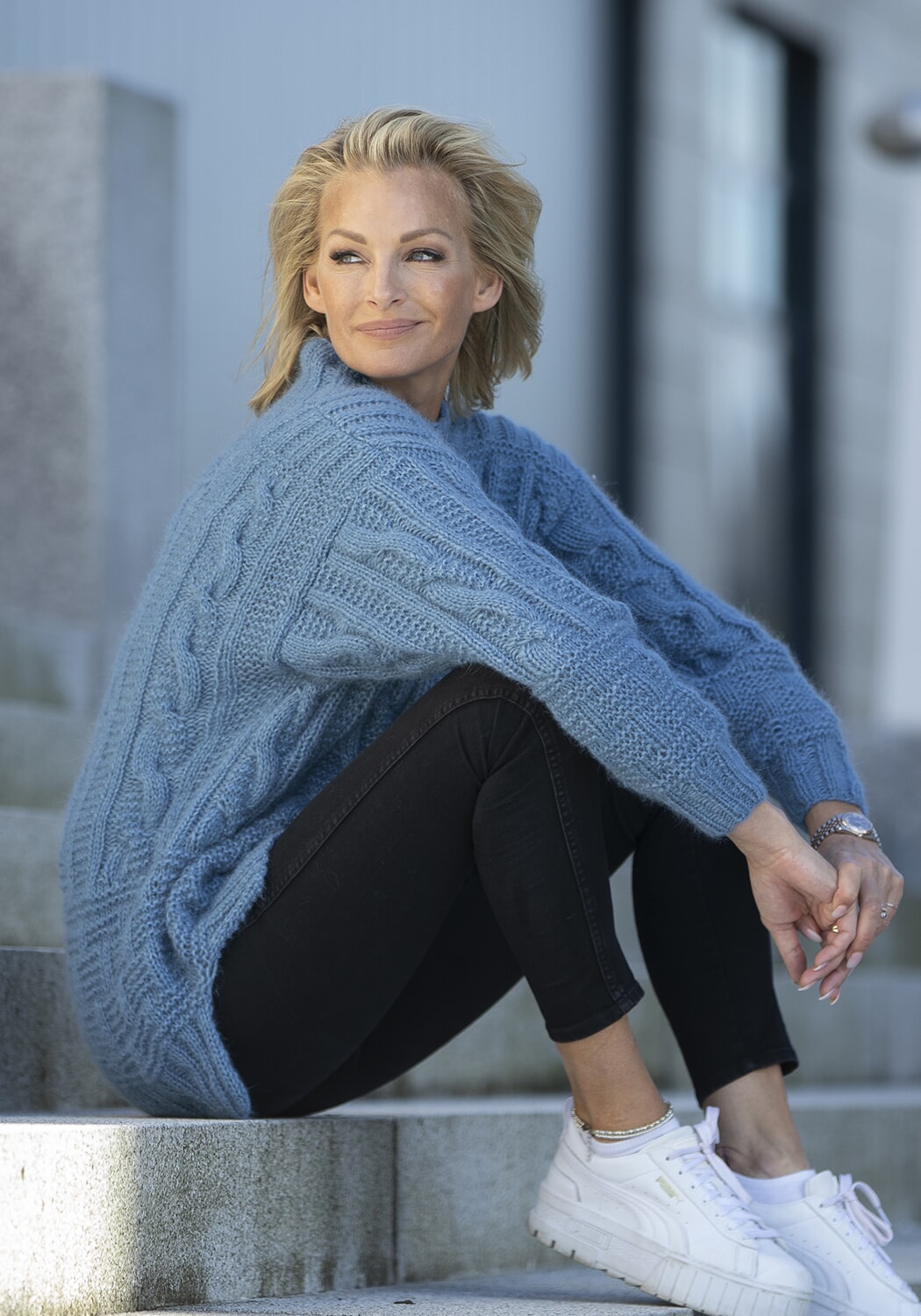 Størrelser: x/liten - liten - middels - stor - x/stor - xx/stor Overvidde: 85 - 96 - 107 - 117 - 128 - 139 cm Hel lengde foran: 65 - 66 - 67 - 68 - 69 - 70 cm Hel lengde bak: 67 - 68 - 69 - 70 - 71 - 72 cm Ermelengde: 48 - 49 - 50 - 51 - 52 - 53 cm GARN: Alpaca Bris (60% Baby Alpaca, 11% Merino Ull, 29% Nylon), nøster à 50 gr. Lys jeansblå nr 326: 7 - 7 - 8 - 9 - 9 - 10 nøster Veiledende pinner: Pinner nr 5 og 6. Strikkefasthet: 15 m glattstrikk i bredden på pinne nr 6 eller 7 måler ca 10 cm. Husk at strikkefastheten må holdes hvis resultatet skal bli vellykket.