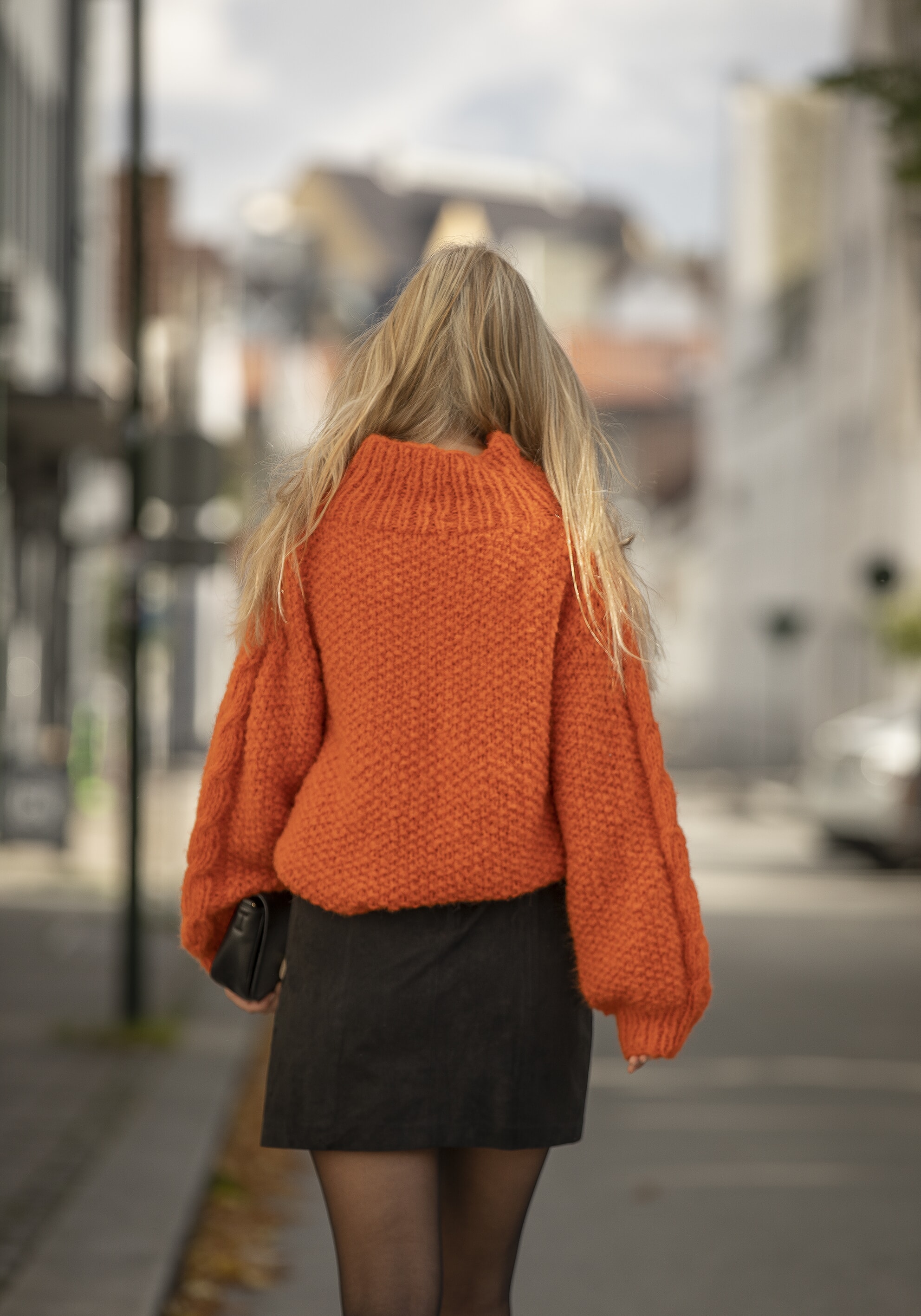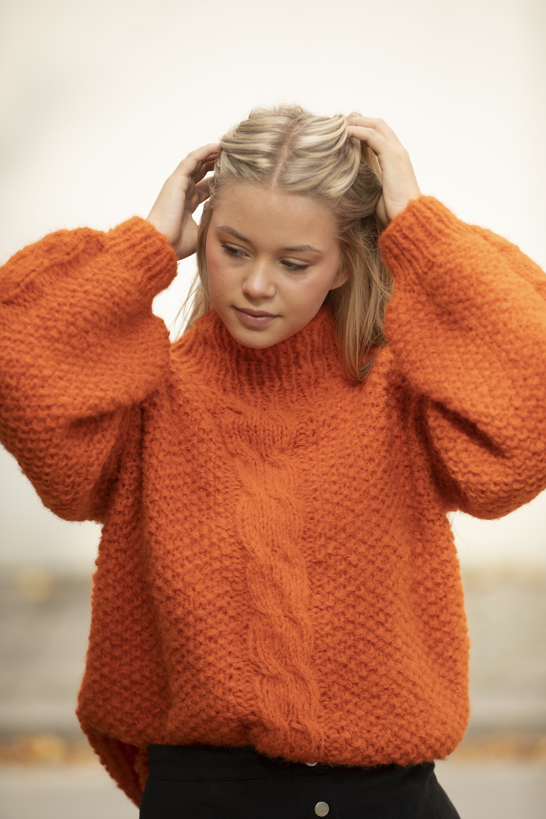 Størrelser: x/liten - liten - middels - stor - x/stor - xx/stor Overvidde: 96 - 104 - 112 - 120 - 128 - 136 cm Hel lengde: 60 - 62 - 64 - 66 - 68 - 68 cm Ermelengde: 50 - 51 - 52 - 52 - 52 - 53 cm GARNALTERNATIV: Alpaca Maya (82% Alpakka Superfine, 13% Merino, 5% nylon), Mohrino (50% Young Goat Mohair, 41% MerinoUll, 9% Polyamide), nøster à 50 g. Oransje nr 751: 9 - 10 - 10 - 11 - 11 - 12 nøster Veiledende pinner: Pinner nr 7 og 9. Strikkefasthet: 10 m glattstrikk i bredden med to tråder på pinne nr 9 måler ca 10 cm. Husk at strikkefastheten må holdes hvis resultatet skal bli vellykket. Genseren strikkes i dobbelt garn.
