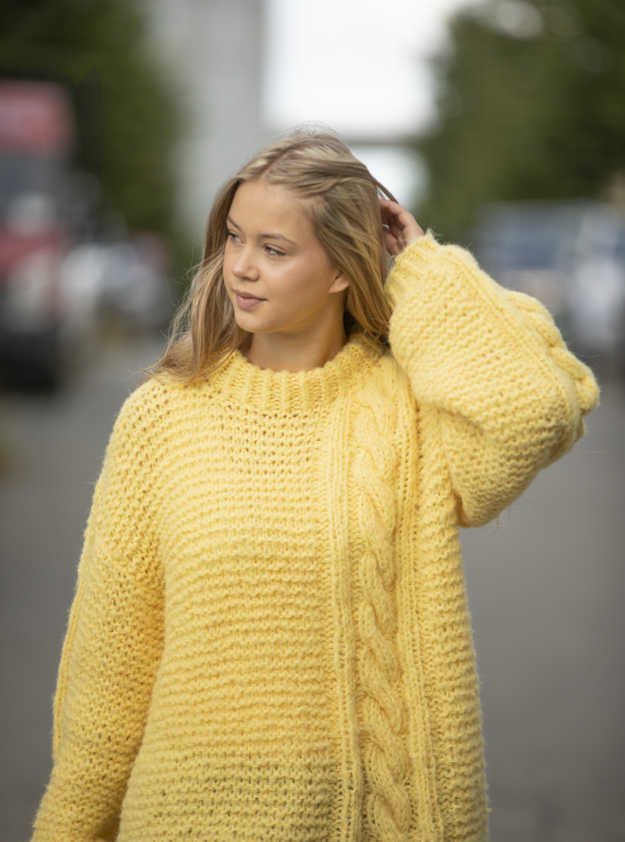 Størrelser: x/liten - liten - middels - stor - x/stor - xx/stor Overvidde: 100 - 108 - 116 - 124 - 132 - 140 cm Hel lengde: 63 - 64 - 65 - 67 - 69 - 70 cm Ermelengde: 51 - 52 - 52 - 53 - 53 - 54 cm GARNALTERNATIV: Alpaca Maya (82% Alpakka Superfine, 13% Merino, 5% nylon), Mohrino (50% Young Goat Mohair, 41% MerinoUll, 9% Polyamide), nøster à 50 g. Lys gul nr 744: 8 - 9 - 10 - 10 - 11 - 11 nøster Veiledende pinner: Pinner nr 7 og 9. Strikkefasthet: 10 m glattstrikk i bredden med to tråder på pinne nr 9 måler ca 10 cm. Husk at strikkefastheten må holdes hvis resultatet skal bli vellykket. Genseren strikkes i dobbelt garn
