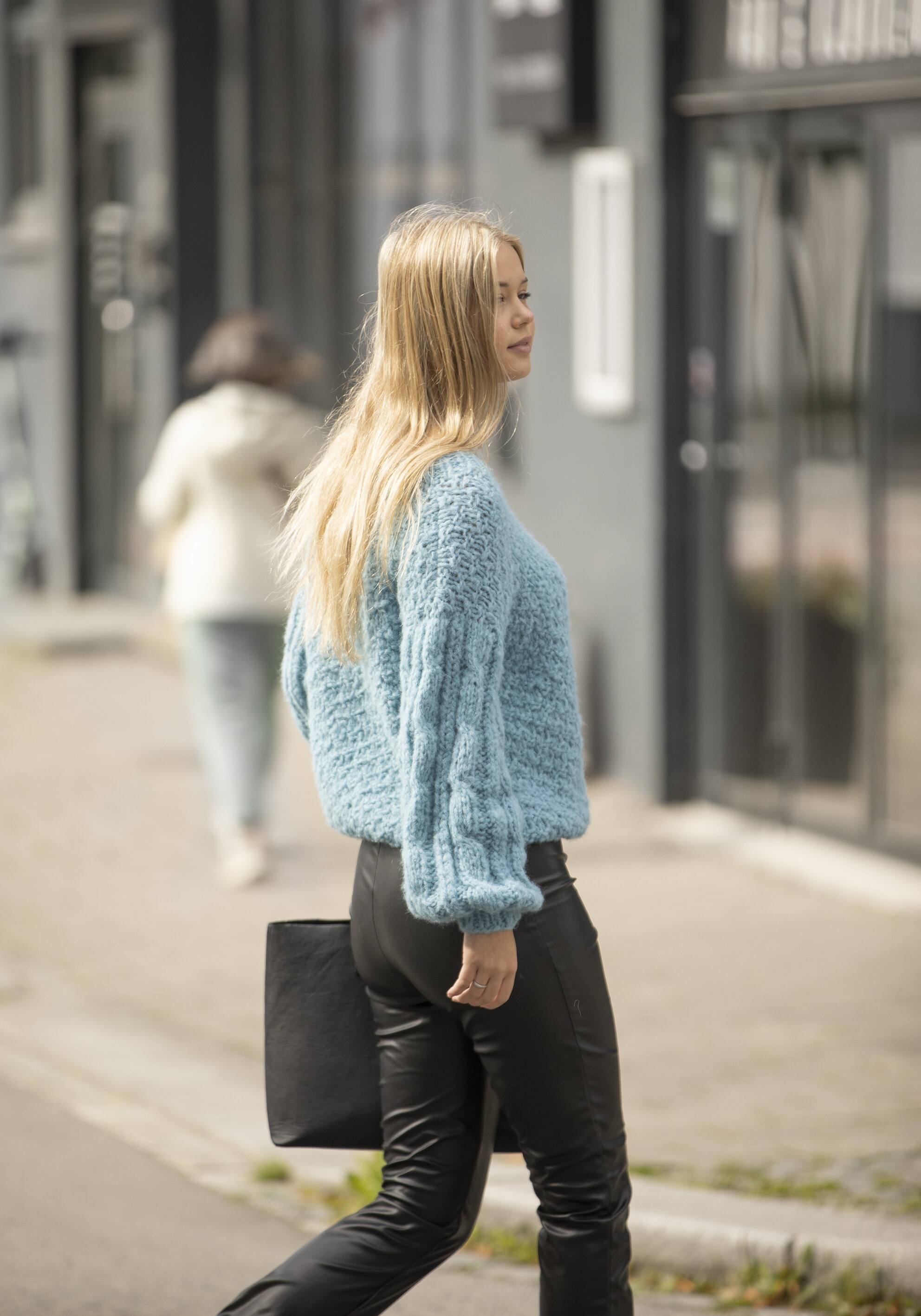 Størelser: x/liten - liten - middels - stor - x/stor - xx/stor Overvidde: 100 - 108 - 116 - 120 - 128 - 136 cm Hel lengde: 55 - 55 - 58 - 59 - 62 - 62 cm Ermelengde: 46 - 47 - 48 - 49 - 50 - 51 cm GARNALTERNATIV: Alpaca Maya (82% Alpakka Superfine, 13% Merino, 5% nylon), Mohrino (50% Young Goat Mohair, 41% MerinoUll, 9% Polyamide), nøster à 50 g. Lys turkis nr 768: 6 - 7 - 7 - 8 - 8 - 9 nøster Veiledende pinner: Pinner nr 7 og 9. Strikkefasthet: 10 m glattstrikk i bredden med to tråder på pinne nr 9 måler ca 10 cm. Husk at strikkefastheten må holdes hvis resultatet skal bli vellykket. Genseren strikkes i dobbelt garn.