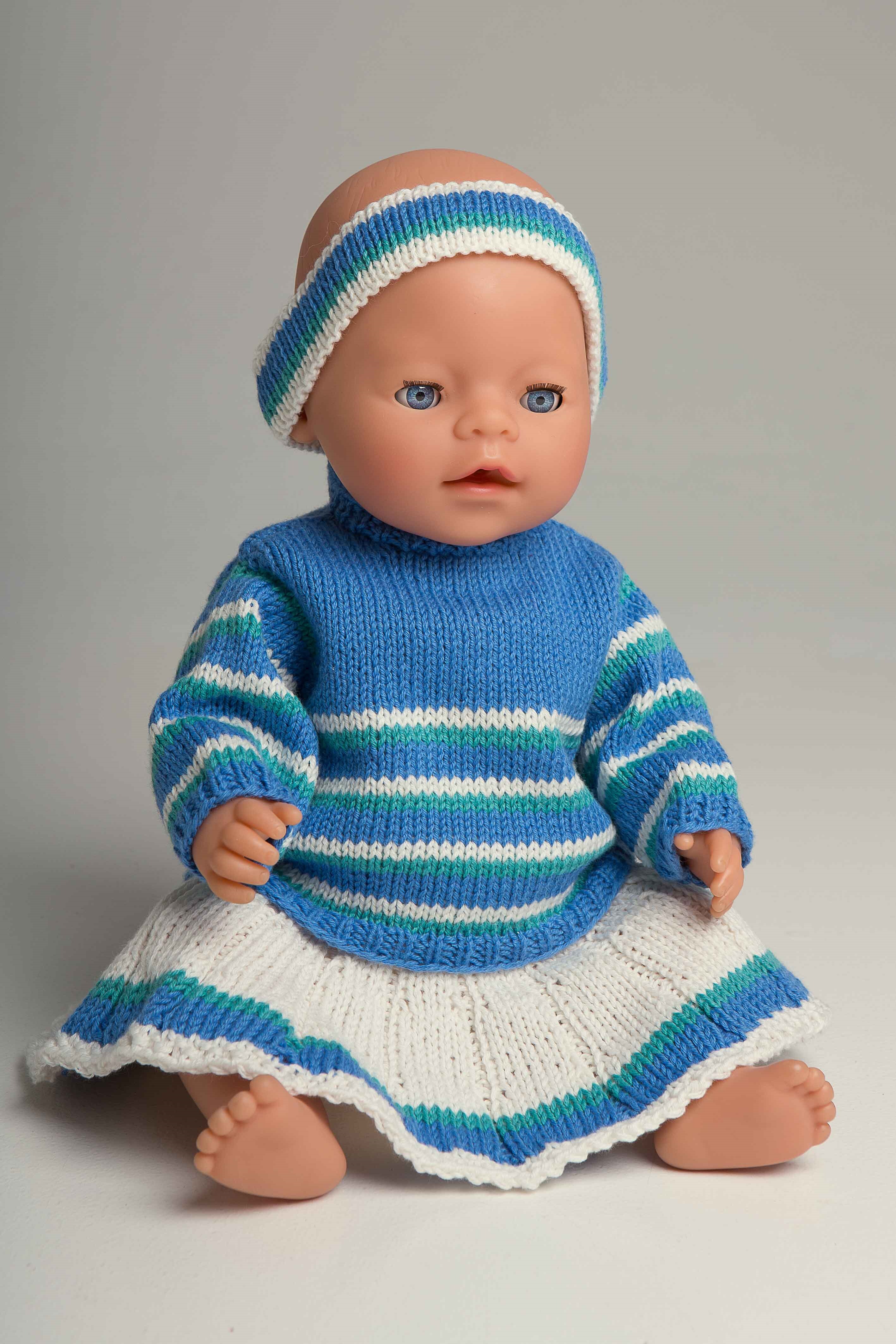Viking Bjørk Genser og skjørt 1303-2 Størrelse: Babyborn Overvidde: 36 cm Hel lengde: 16 cm Ermelengde: 12 cm GARNALTERNATIV: Viking Bjørk ( 90% bomull, 10% merino ull), Viking Alpaca Silk ( 50% alpakka , 50% silke), nøster à 50g. Naturhvit nr 502: 1 nøste Blå nr 523: 1 nøste Mint grønn nr 527: 1 nøste Pinner og tilbehør: Rundpinne og strømpepinner nr 2 ½ og 3 + 2 knapper og ca 30 cm elastikk. Strikkefasthet: 25 m glattstrikk i bredden på p nr 3 måler ca 10cm. Husk at strikkefastheten må holdes hvis resultatet skal bli vellykket
