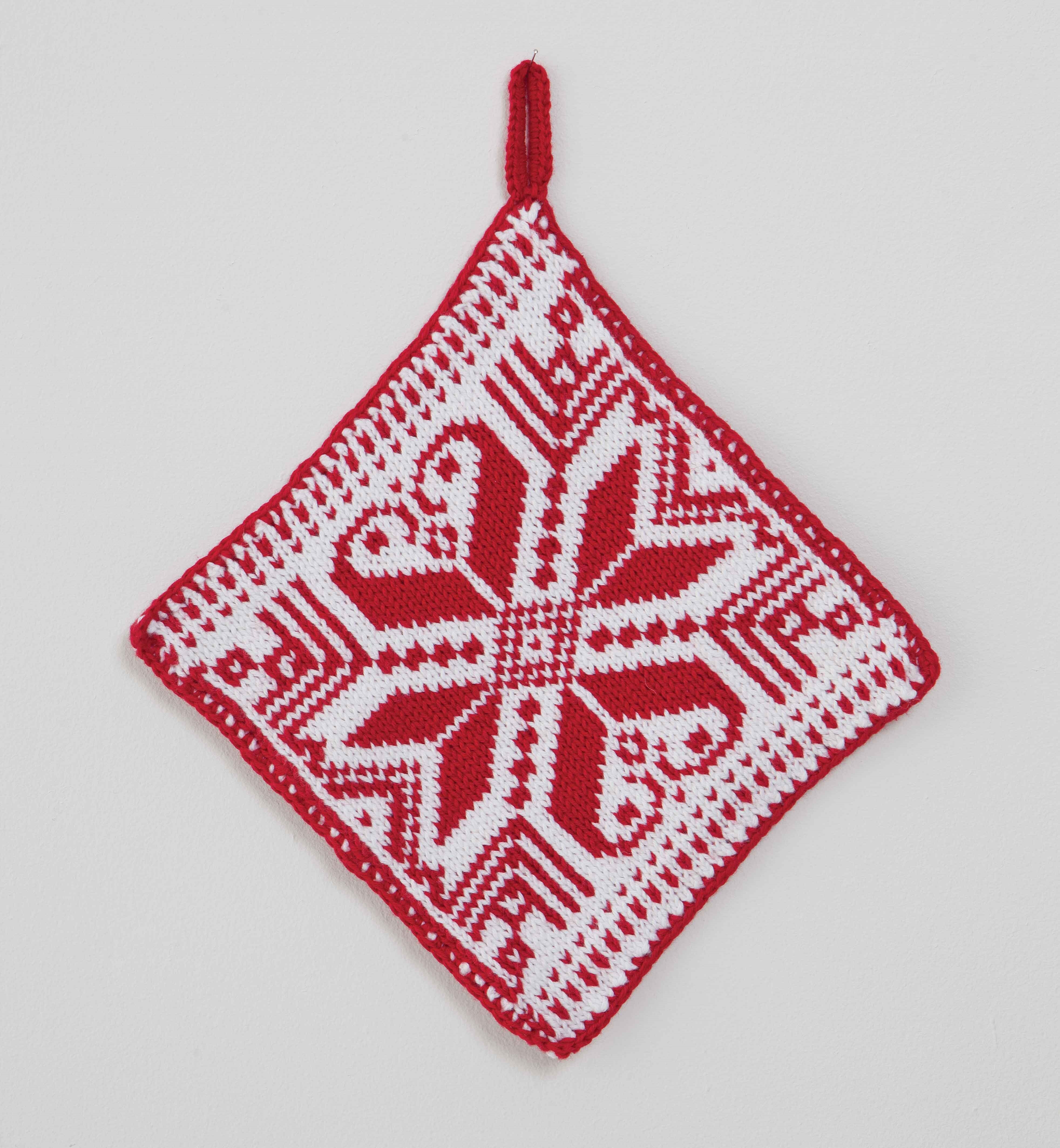 Viking Bjørk 1115-9 Gryteklut Størrelse: ca 20X20 cm GARNALTERNATIV: Viking Bjørk (90% bomull, 10% merino ull), nøster à 50 gr. rødt nr 450 ca 1 nøste hvitt nr 400 ca 1 nøste Pinner og tilbehør: liten rundp nr 3. Heklenål 3mm. Strikkefasthet: 25 m glattstrikk i bredden på p nr 3 måler ca 10 cm. Husk at strikkefastheten må holdes hvis resultatet skal bli vellykket.