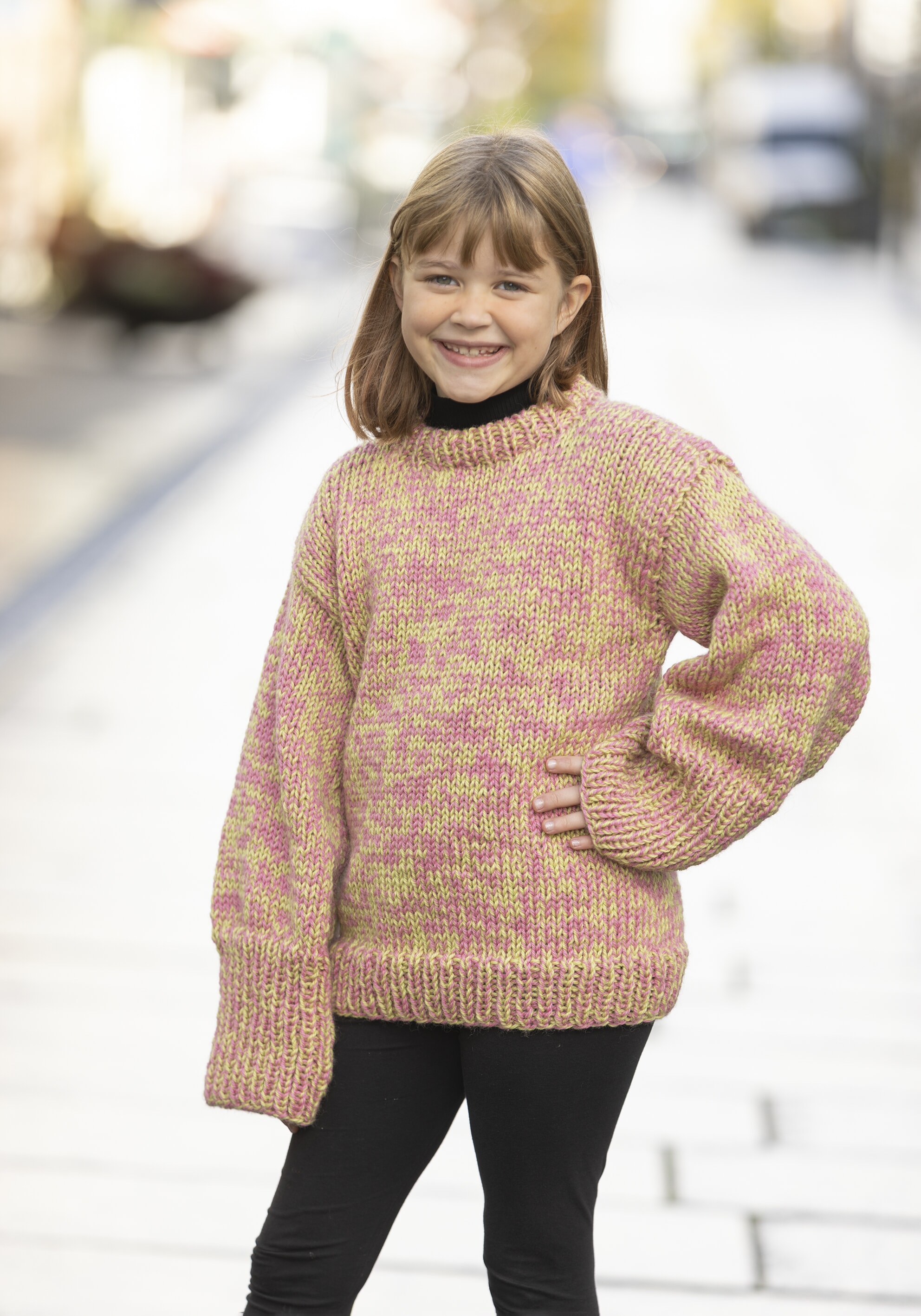 Hele plagget er strikket med dobbel tråd, 1 tråd gammelrosa og 1 tråd lys grønn.