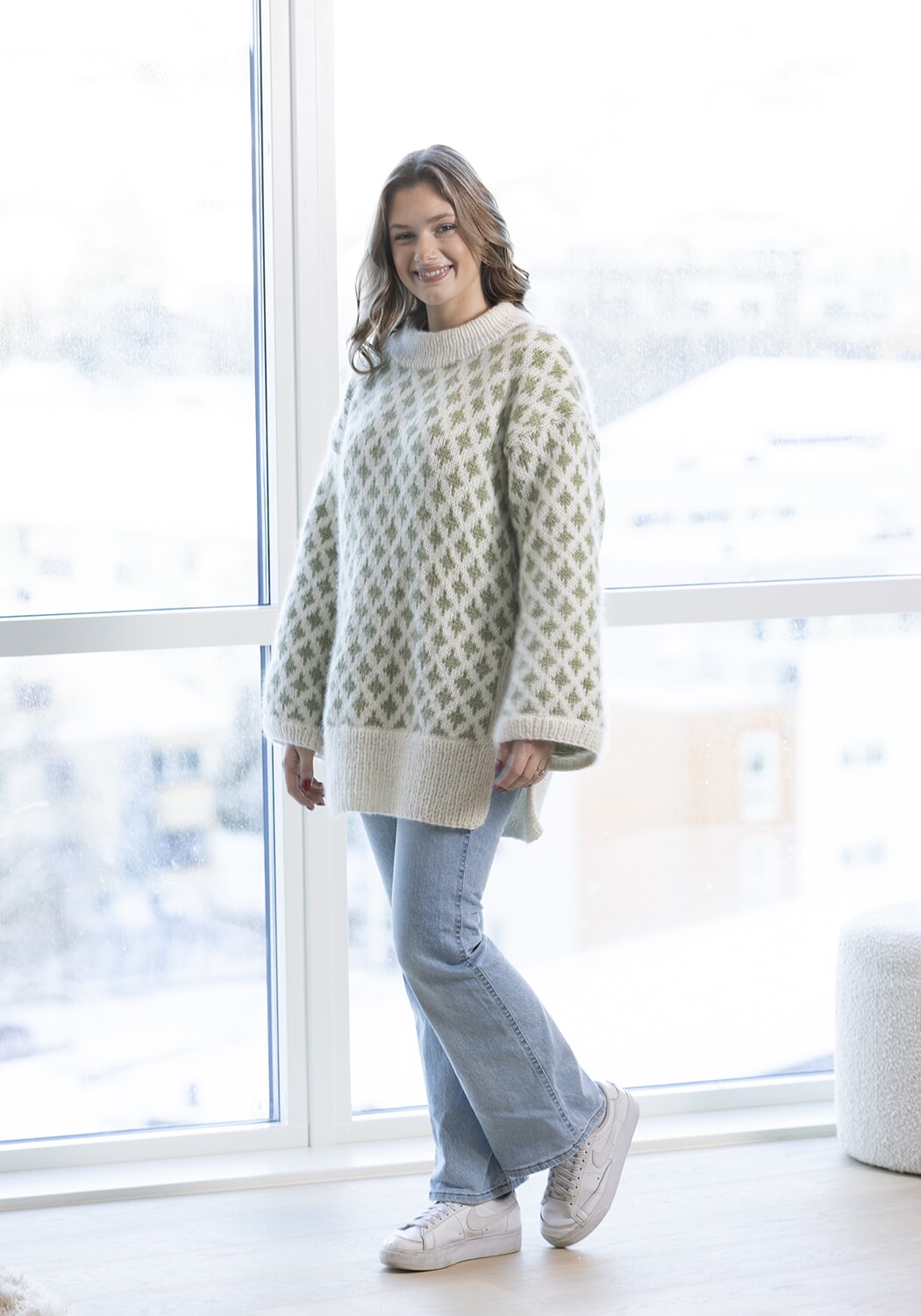 Strikkefasthet: 16 m glattstrikk i bredden på pinne nr 6 eller 7 måler ca 10 cm. Husk at strikkefastheten må holdes hvis resultatet skal bli vellykket.