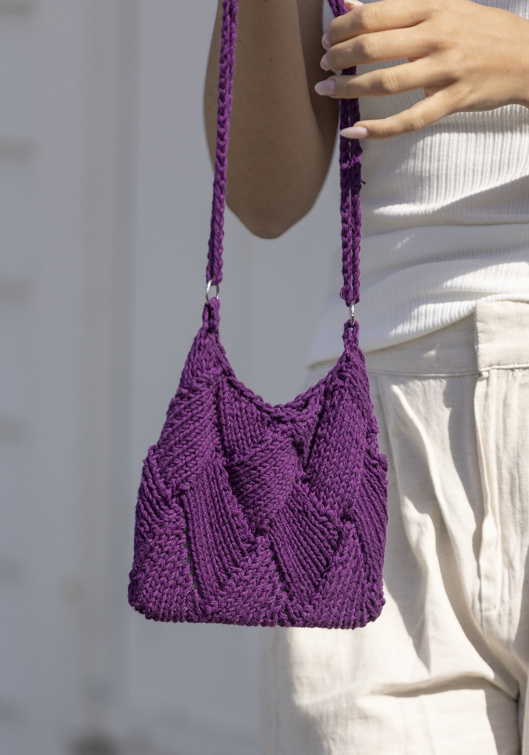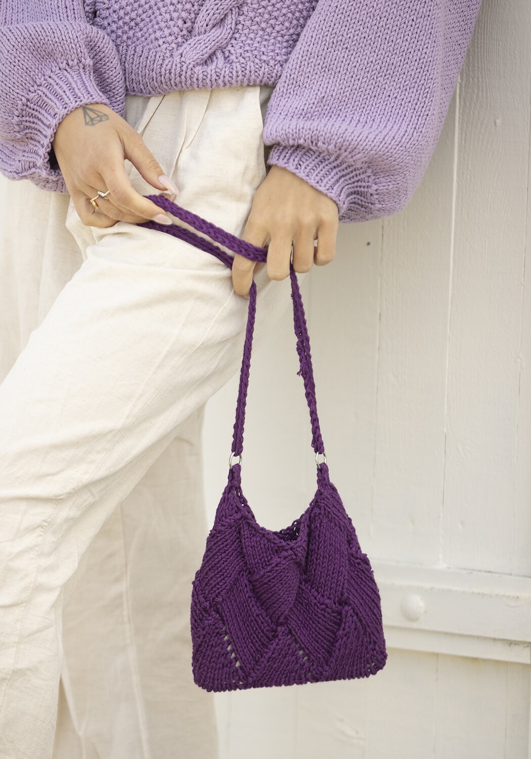 Teknikken som brukes i denne oppskriften kalles kontestrikk. Vesken strikkes ovenfra og ned med dobbel tråd.