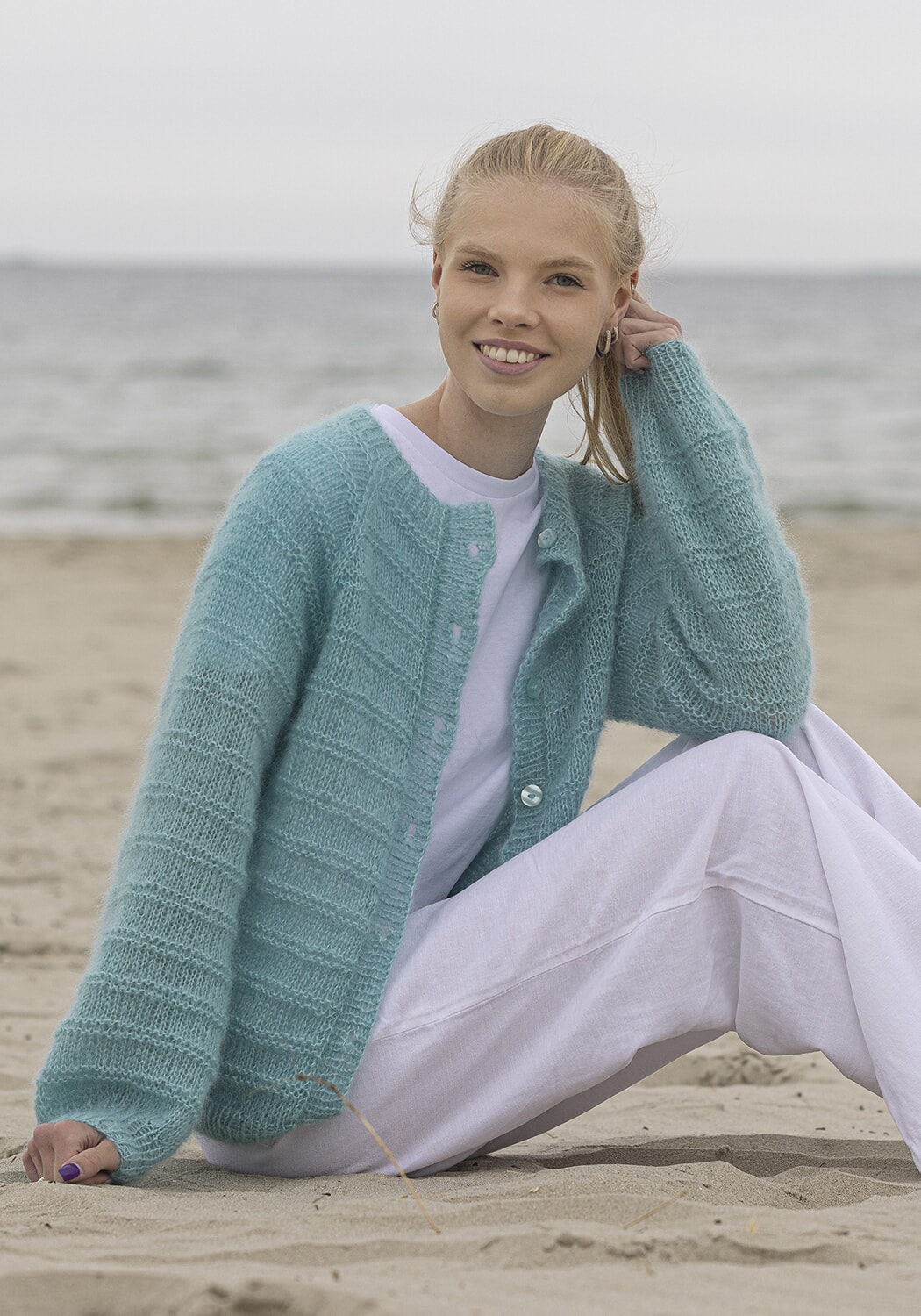 Strikkefasthet: 16 m glattstrikk i bredden med dobbel tråd på pinne nr 5 måler ca 10 cm. Husk at strikkefastheten må holdes hvis resultatet skal bli vellykket.