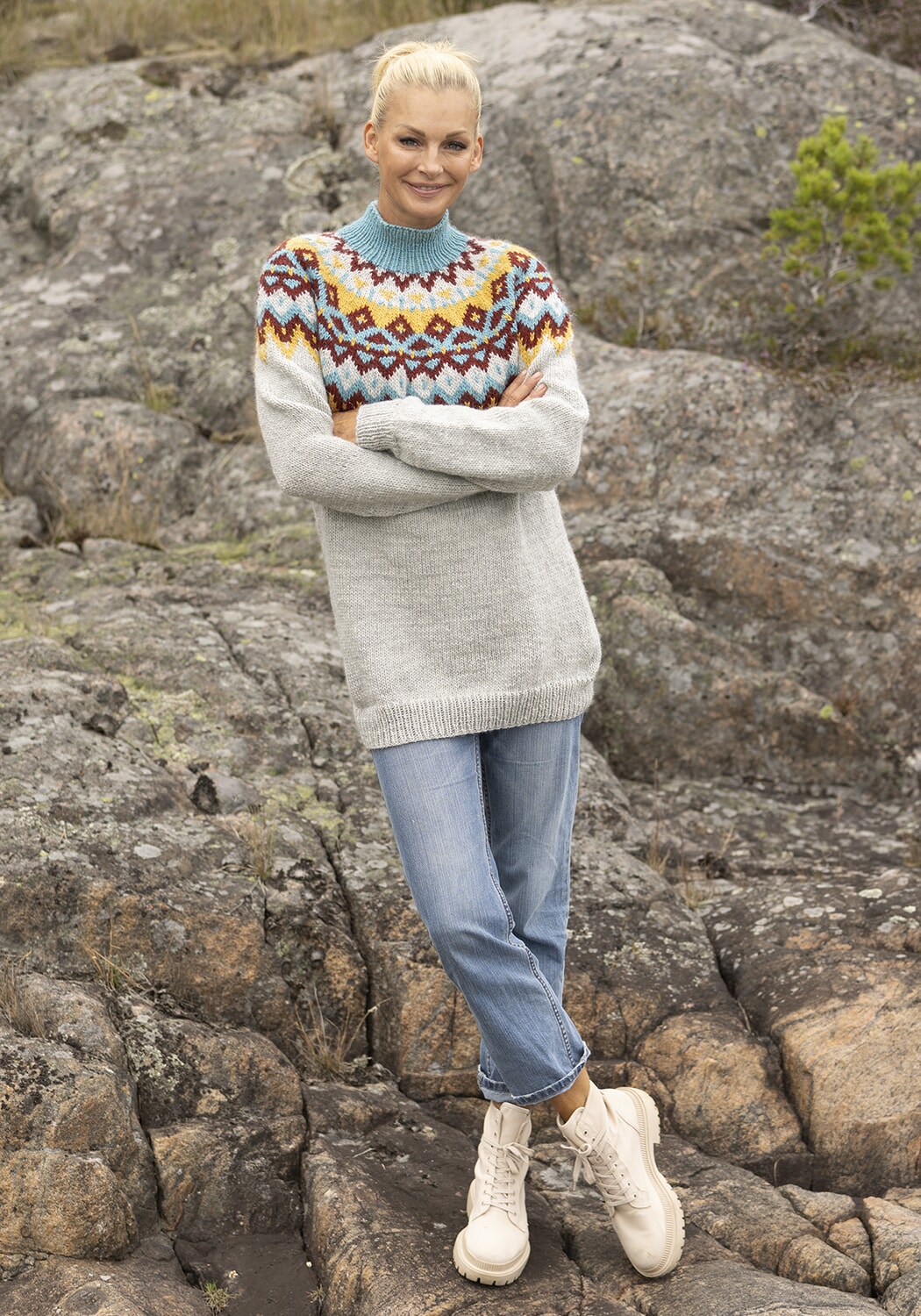 Strikkefasthet: 18 m glattstrikk i bredden på pinne nr 5 måler ca