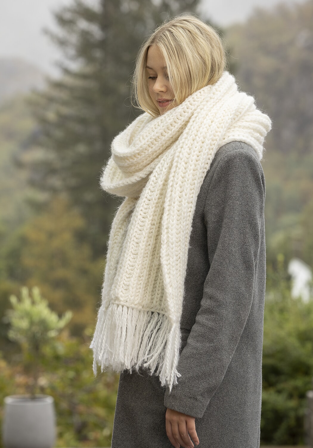 Skjerfet er strikket i dobbelt garn med 1 tråd av hver.