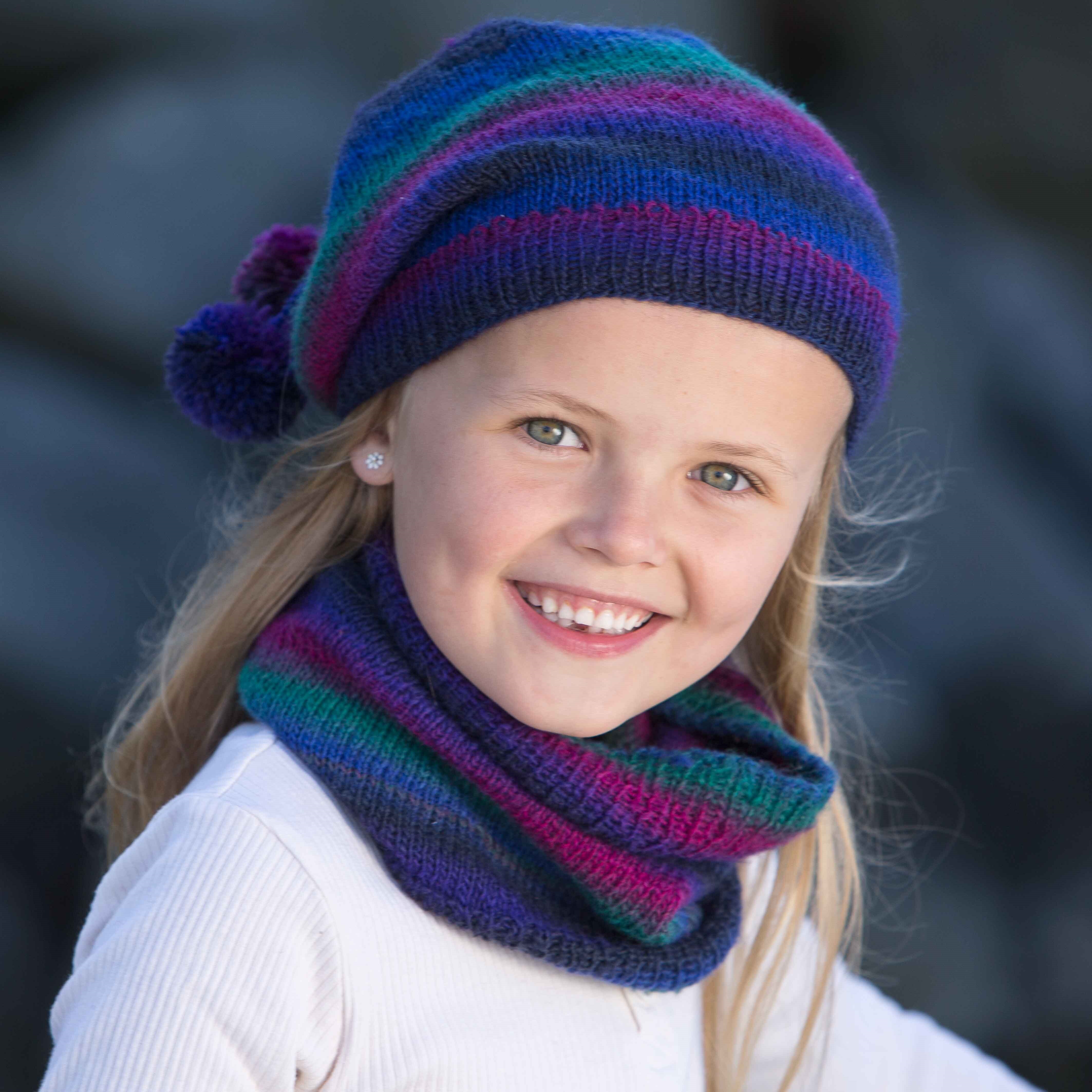 Viking Nordlys Lue og hals 1306-21 Størrelser: 2-4 og 6-10 år GARNALTERNATIV:Viking Nordlys ( 75% superwash ull , 25% nylon ) , nøster à 100g. Viking Baby ull ( 100 % merino ull , superwash ). Viking Alpaca Fine (85% Alpakka Superfine – 15% highland wool), Viking pure milk fiber (100% melkefiber), nøster à 50 g. Multi nr 965 : 1 - 1 nøste Veiledende pinner og tilbehør: Rundpinne og strømpepinne nr 2½ og 3 Strikkefasthet: 28 m glattstrikk i bredden på p nr 3 måler ca 10 cm. Husk at strikkefastheten må holdes hvis resultatet skal bli vellykket.