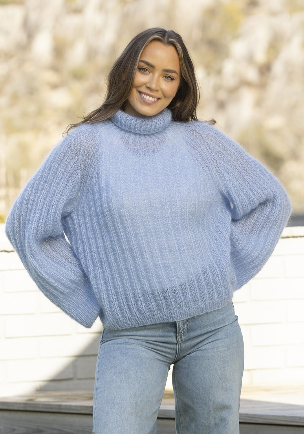 Hele plagget strikkes med 2 tråder Kid Silk.