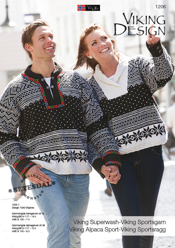 Viking Superwash Orginal setesdal 1206-1 Størrelse: 36- 38- 40/42- 48/50- 52- 54 Overvidde: 104- 111- 118- 125- 132- 139cm Hel lengde m/bånd: 66- 67- 68- 70- 72- 74cm Hel lengde m/skjarlskrage: 58- 59- 60- 62- 65- 68cm Ermelengde: 44- 46- 48- 50- 52- 52cm GARNALTERNATIV: Viking Superwash(100% ull, superwash), Viking Alpaca Sport (30% alpakka, 40% merino ull, 30% nylon), Viking Sportsragg (60% ull, 20% nylon, 20% akryl), Viking Sportsgarn (100% ull), nøster à 50g. Genser m/bånd Koksgrå nr 117: 12- 12- 13- 13- 14- 14 nøster Hvitt nr 100: 6- 6- 7- 7- 7- 8 nøsterGenser m/skjarlskrage Koksgrå nr 117: 10- 10- 11- 11- 12- 12 nøster Hvitt nr 100: 8- 8- 9- 9- 10- 10 nøster Veiledende pinner: Rundpinne og strømpepinner nr 3 og 3 ½ . Tilbehør til genser med bånd ( herre): 4 kofteknapper , 2 hekter + 3m bånd. Tilbehør til genser m/skjarlskrage ( dame): 4 kofteknapper. Strikkefasthet: 23 m glattstrikk i bredden på pinne nr 3 ½ måler ca 10cm . Husk at strikkefastheten må holdes hvis resultatet skal bli vellykket.