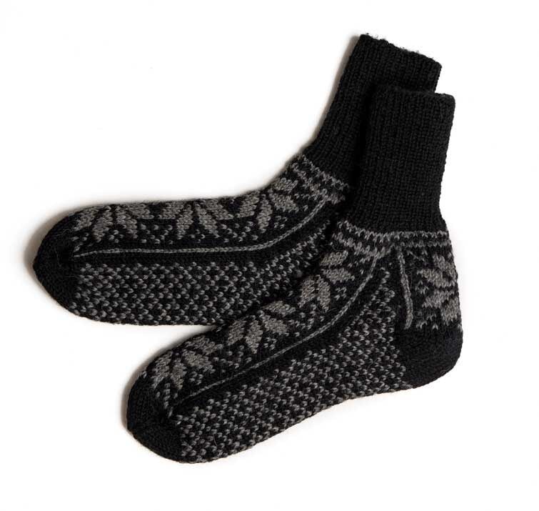 Viking Superwash 1213-28b Strømper Størrelse 37/39- 40/42- 44/46 Fotlengde ca 20- 22- 24 cm GARNALTERNATIV: Viking Superwash(100% ull, superwash), Viking Alpaca Sport (30% alpakka, 40% merino ull, 30% nylon), Viking Sportsragg (60% ull, 20% nylon, 20% akryl), Viking Sportsgarn (100% ull), nøster à 50g. STRØMPER Svart nr 103 ca 2- 2- 2 nøster Grå nr 115 ca 1- 1- 1 nøste Veiledende pinner og tilbehør: Rundpinne og strømpepinner nr 3 og 3 ½ . Strikkefasthet: 23 m glattstrikk i bredden på pinne nr 3 ½ måler ca 10cm . Husk at strikkefastheten må holdes hvis resultatet skal bli vellykket.