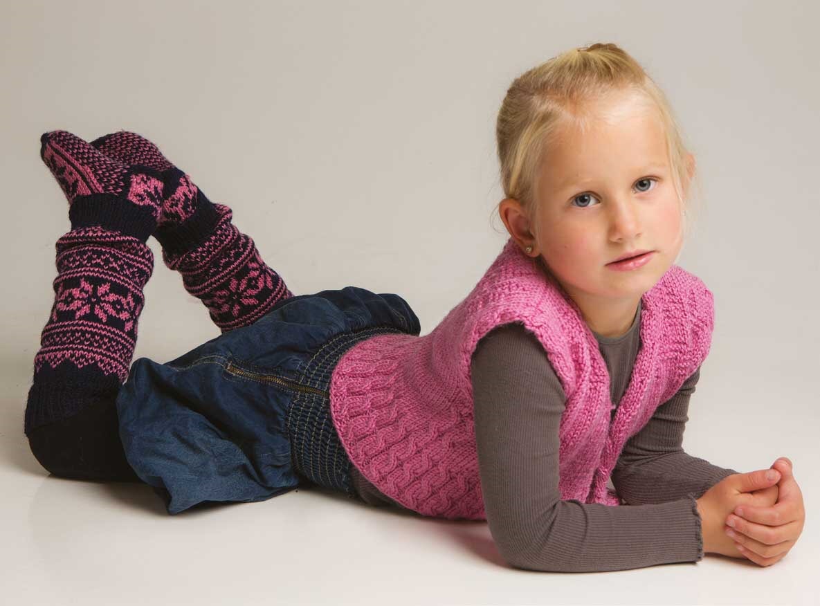Viking Sportsragg Leggvarmere og vest 1212-12 Størrelse 2/4- 6- 8- 10/12år Overvidde 62- 70- 76- 83 cm Hel lengde 27- 32- 37- 45 cm GARNALTERNATIV: Viking Superwash(100 ull, superwash), Viking Alpaca Sport (30% alpakka, 40% merino ull, 30% nylon), Viking Sportsragg (60% ull, 20% nylon, 20% akryl), Viking Sportsgarn (100% ull), nøster à 50g. VEST Rosa nr 581 ca 3- 4- 4- 5 nøster LEGGVARMERE (str: 2/4- 6/8- 10/12 år) Marine nr 526 ca 1- 1- 2nøster Rosa nr 581 ca 1- 1- 1 nøste Veiledende pinner og tilbehør: Rundpinne og strømpepinner nr 3 og 3 ½ . Strikkefasthet: 23 m glattstrikk i bredden på pinne nr 3 ½ måler ca 10cm . Husk at strikkefastheten må holdes hvis resultatet skal bli vellykket.
