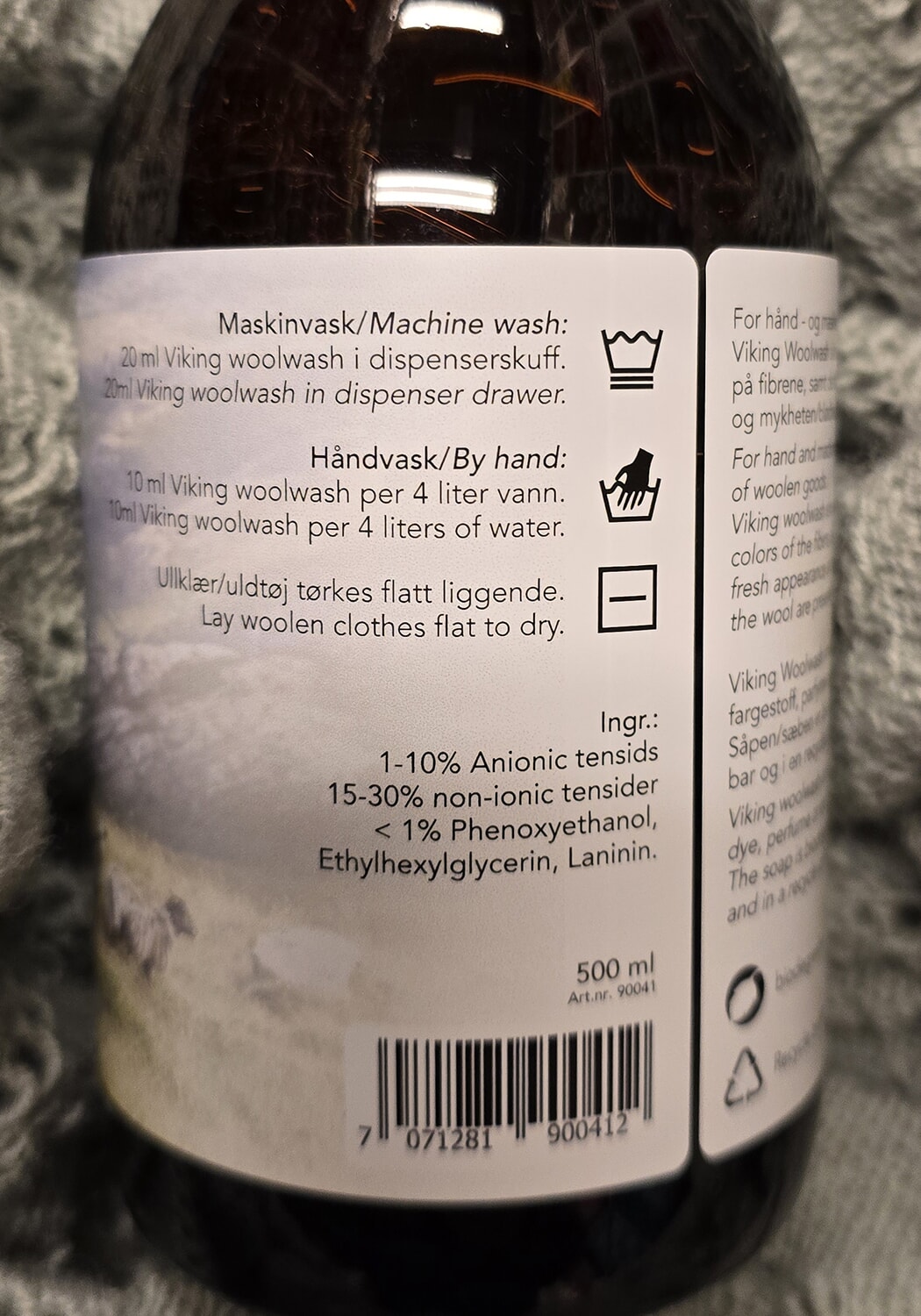 Til hånd-og maskinvask av ull. Ullsåpen gir et optimalt resultat, og sikrer at fibrenes farge, ullens friske utseende og mykhet bevares. Viking Woolwash inneholder ikke fargestoff, parfyme eller enzymer. Såpen er også bionedbrytbar.